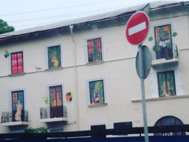 Для этого какие-то художники полностью покрыли оконные пролеты изображениями разных людей. В одном окне виднеется играющий на скрипке музыкант, в другом — мечтательный мужчина смотрит в небо, в третьем — девушка в белых одеяниях якобы вышла на балкон.