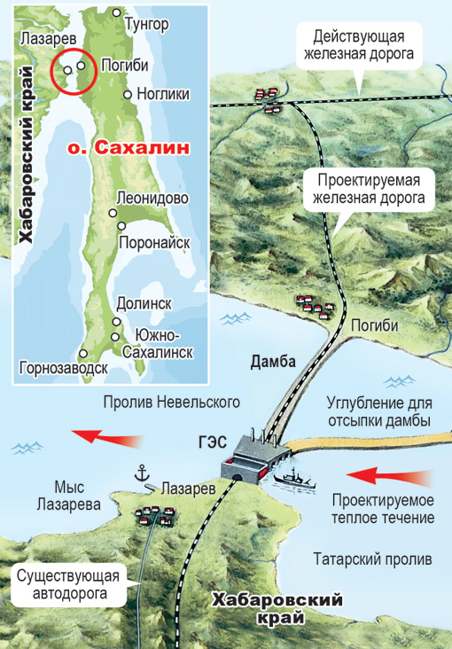 Расстояние между берегами в самом узком месте - всего 7,3 километра, глубина 7,2 метра. По мнению экспертов, сделать здесь укрепление не составит труда. Для прохода рыбы и судов предлагается устроить шлюзы. А еще возвести электростанцию, которая будет работать за счет энергии приливов и отливов. Дамба перекроет доступ холодных вод в Татарский пролив из Охотского моря. Влияние теплых вод будет ощущаться на расстоянии 100 км в обе стороны от дамбы. Сахалин, восточное Приморье и южная часть Хабаровского края превратятся в тропики. Порты Совгавань, Де-Кастри, Ванино станут незамерзающими.