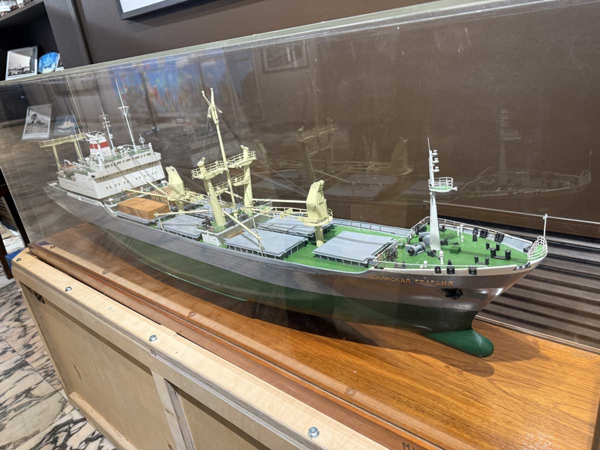 «Уникальным экспонатом является макет теплохода «Ленинская гвардия», который был важной частью советского торгового флота и доставлял какао бобы из стран Африки в СССР, корабельный штурвал, фотографии и документы», - отметил на открытии выставки Колобаев Сергей Александрович, директор Музея морского и речного флота.