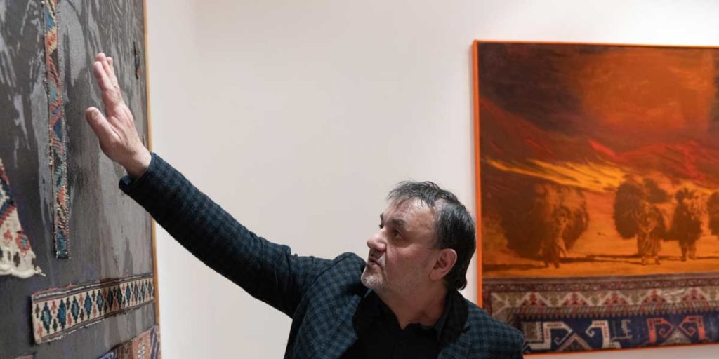 При первом взгляде кажется, что незамысловатая живопись – несколько выразительных линий, вступает в диссонанс с дагестанским ковром ручной работы, над которым трудилась с утра до ночи группа мастериц, но если всмотреться, почувствуем гармонию…Несколькими штрихами передать настроение, образ, внутренний мир – дорого стоит! И на такое способен только Мастер, каким является Аладдин Гарунов: