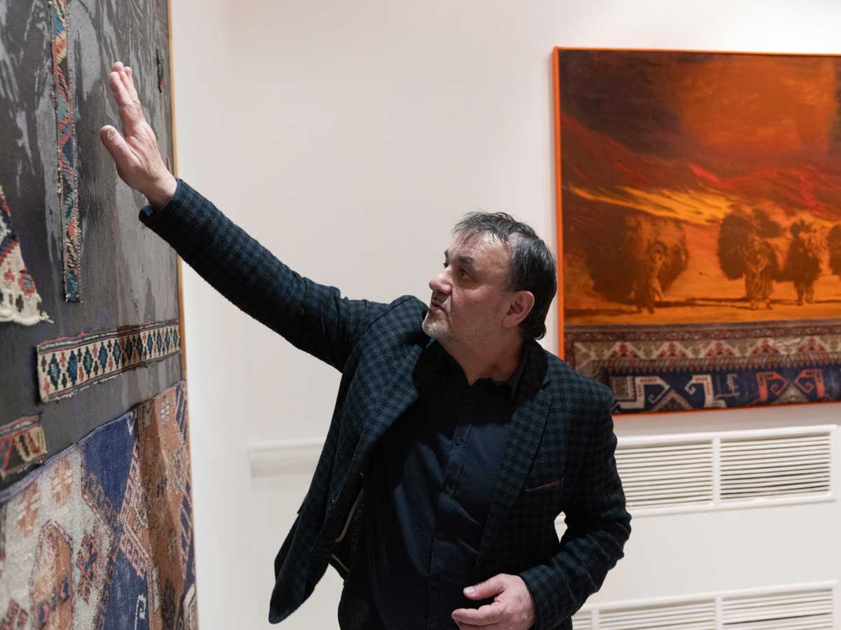 При первом взгляде кажется, что незамысловатая живопись – несколько выразительных линий, вступает в диссонанс с дагестанским ковром ручной работы, над которым трудилась с утра до ночи группа мастериц, но если всмотреться, почувствуем гармонию…Несколькими штрихами передать настроение, образ, внутренний мир – дорого стоит! И на такое способен только Мастер, каким является Аладдин Гарунов: