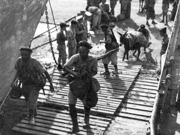В 1943 году состоялась знаменитая высадка союзнических войск на Сицилию, и американцы получили в свое распоряжение несколько подразделений марокканских бойцов, уже успевших повоевать за Корсику. С ноября 1943 года африканские воины в тюрбанах и полосатых джеллабах (халат с капюшоном) были переброшены на материк.