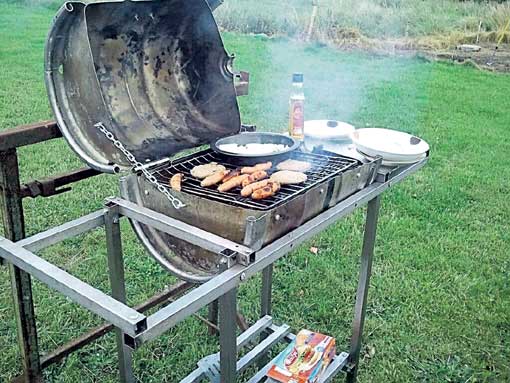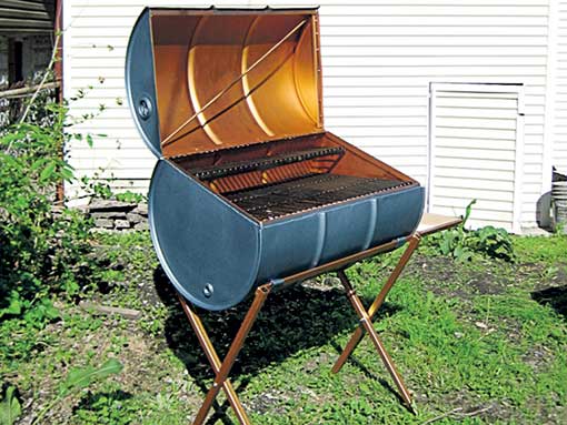 Ваш мангал будет с крышкой, что очень удобно. Но придется приложить руку мужчинам. С помощью шлифмашины отрежьте часть бочки, которая будет служить крышкой. К отрезанной части приварите петли и ручки. Ножками для мангала послужат металлические уголки - приварите их к торцевой части. Из металлических бочек можно также соорудить стильную мебель.