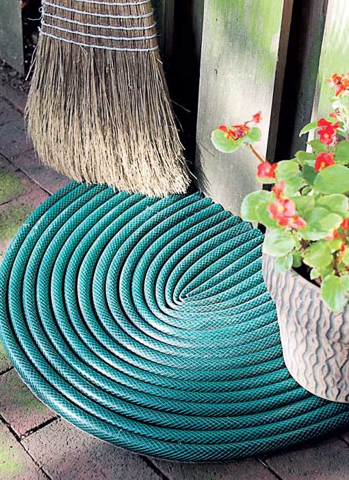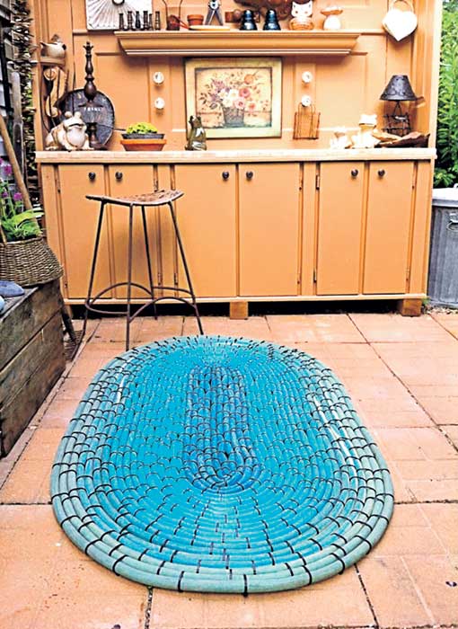Скрутите старый дырявый шланг, как на фото, и закрепите его пластмассовыми хомутами. Прекрасный коврик для террасы или беседки готов.