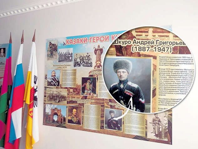 В детском саду Краснодара горе-воспитатели повесили плакат с изображением предателя Андрея Шкуро. В белой армии он воевал в чине генерал-лейтенанта, у фашистов дослужился до группенфюрера СС. В 1947 году за свои преступления иуда был повешен. Единственная «заслуга» Шкуро - происхождение: эта сволочь родилась кубанским казаком. О чем и сообщает текст рядом с плакатом. Типа, гордитесь, дети, великим земляком. До кучи в число героев Кубанского казачества авторы плаката занесли имена русского конструктора оружия Федора Токарева, атамана войска Донского Матвея Платова, полковника Войска Запорожского Ивана Богуна. Странно, что не включили в пантеон «кубанцев» Кутузова, Суворова и Невского.
