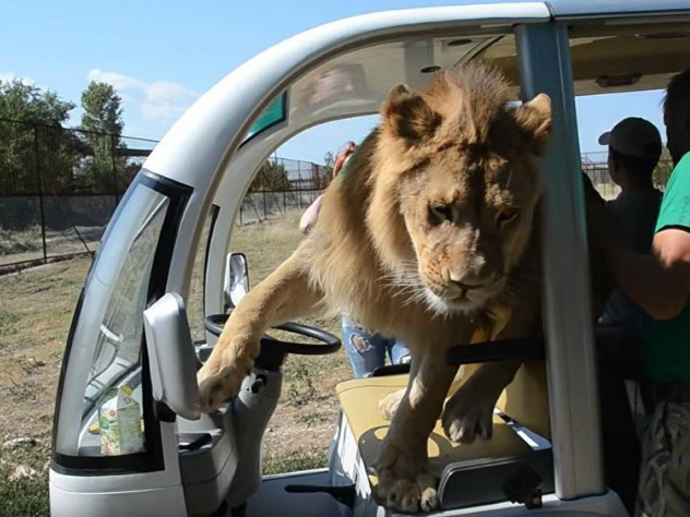 Однако туристов, приехавших на экскурсию в крымский сафари-парк, испугать оказалось не просто. Когда небольшой автобус подъехал в месту, где одиноко дремал Филя, лев оживился и первым делом полез ласкаться с директором парка Олегом Зубковым, который сидел за рулем.