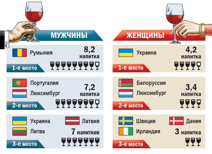 В качестве меры исчисления учеными был взят условный напиток, равный 100 мл красного вина. Установлено, что по миру в среднем женщины пьют 0,73 напитка, а мужчины - 1,7 напитка за день.