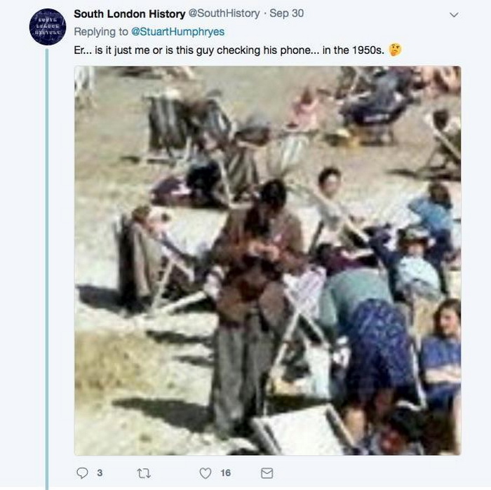 Пользователи Интернета решили, что изображенный на фото человек очень напоминает путешественника во времени, поскольку держит что-то похожее на смартфон. На самом деле качество снимка не позволяет разглядеть, что именно в руках у человека, но поза и положение рук выглядят, как у тех, кто смотрит в смартфон.