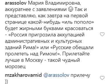 Тогда подписчики пошутили, что Марии стоит осмотрительнее подписывать фотографии, иначе иностранцы могут не на шутку перепугаться. «Так и представляю, как завтра на первой странице какой-нибудь "иль пополо" будет жирными буквами красоваться — "Россия пригрозила аккупацией административных и культурных зданий Рима!" или "Русские обещали пролететь над Римом!"», — отметили в комментариях (орфография и пунктуация авторские. — EG.RU).