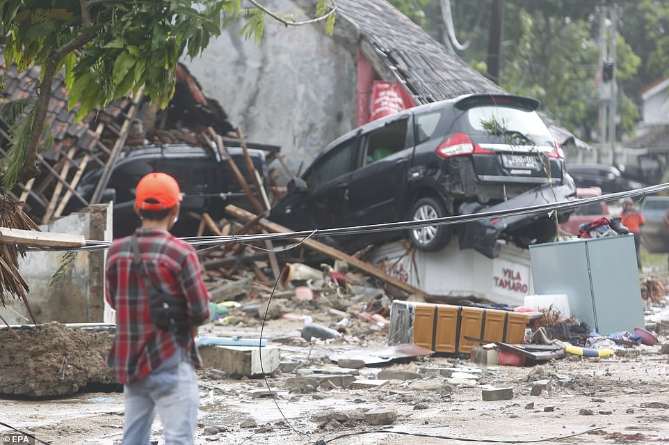 Около 21:30 по местному времени цунами накрыло пляжи вокруг Зондского пролива, между островами Ява и Суматры. Были разрушены 430 домов, девять отелей и 10 кораблей.