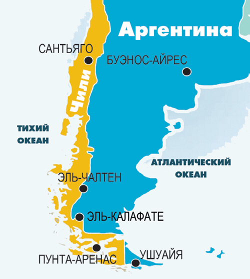 Теперь о Патагонии аргентинской. Ее осмотр начинайте от города Эль-Калафате. Если бронировать заранее, билеты из Буэнос-Айреса обойдутся в $70 - 80. Из чилийского же Пуэрто-Наталеса сюда можно доехать на автобусе за $25.