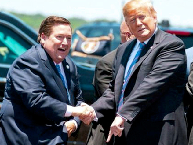 Встречая президента в аэропорту, местный вице-губернатор Билли Нангессер продемонстрировал высокому гостю носки с его портретом. Далось это политику регионального розлива непросто: толстячок лишь при поддержке Трампа смог приподнять ножку.
