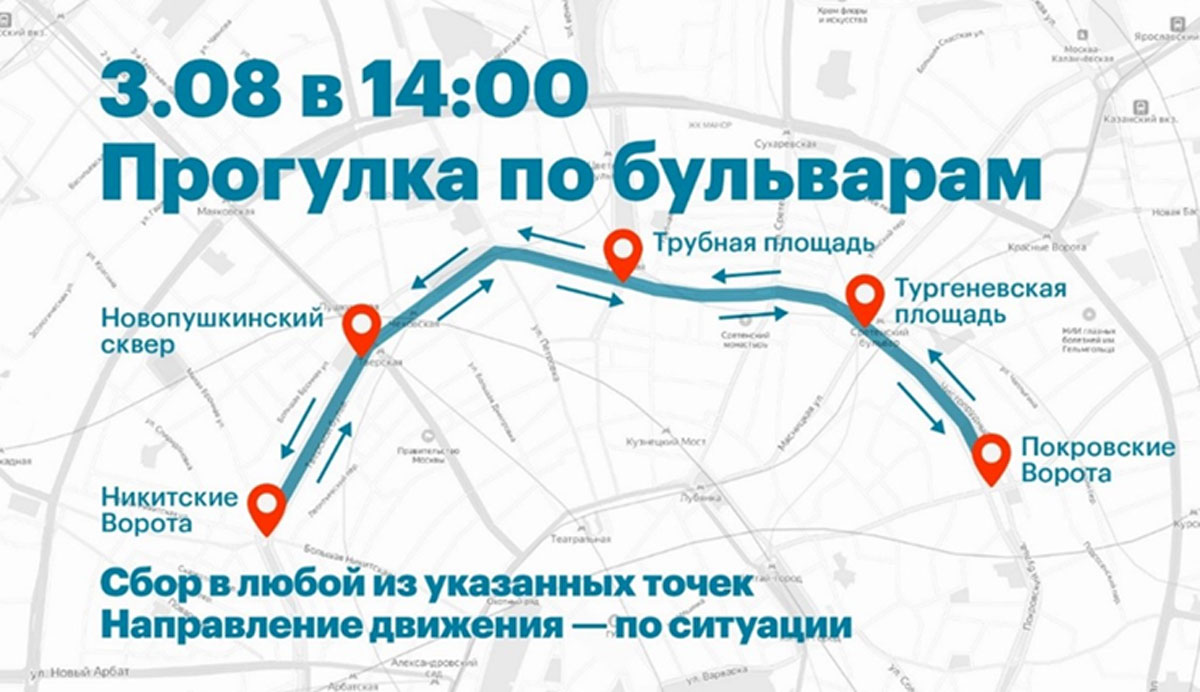 «Сторонники незарегистрированных кандидатов от оппозиции на выборах в Московскую городскую думу планируют собраться и устроить шествие в субботу, 3 августа 2019 года, начиная с 14:00. Пункты сбора на Московском бульварном кольце включают Покровские Ворота, Пречистенские Ворота, Никитские Ворота, Трубную площадь, Тургеневскую площадь и Новопушкинский сквер. Ожидается значительное присутствие полиции. Смотрите карту ниже».