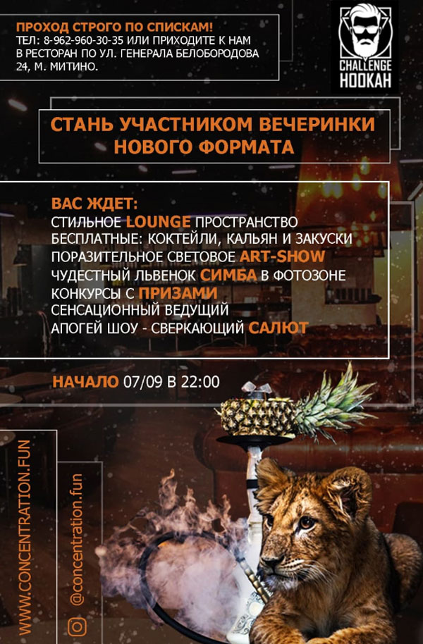 Challenge Hookah – это ресторан премиум-класса, куда приятно заглянуть после рабочего дня, в обеденный перерыв, на выходных, чтобы провести время в уютной и непринужденной атмосфере вместе с друзьями, любимым человеком, коллегами.
