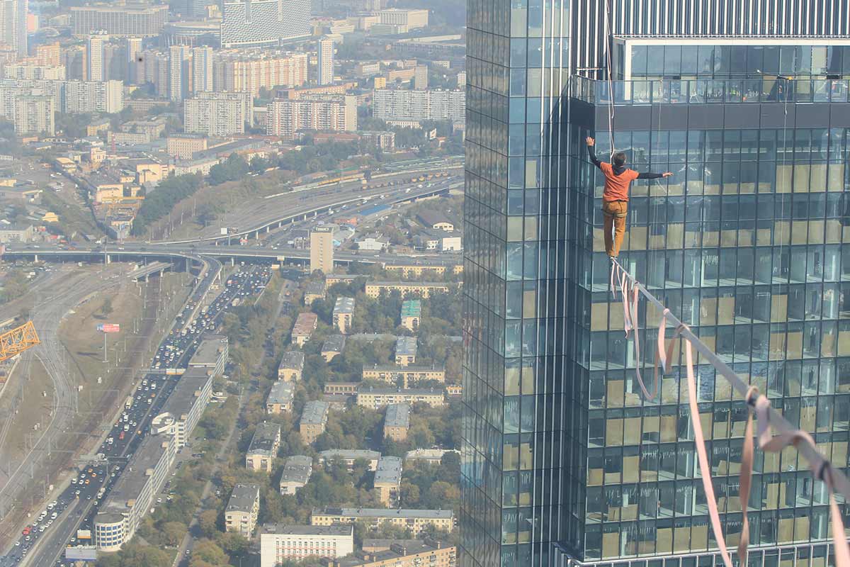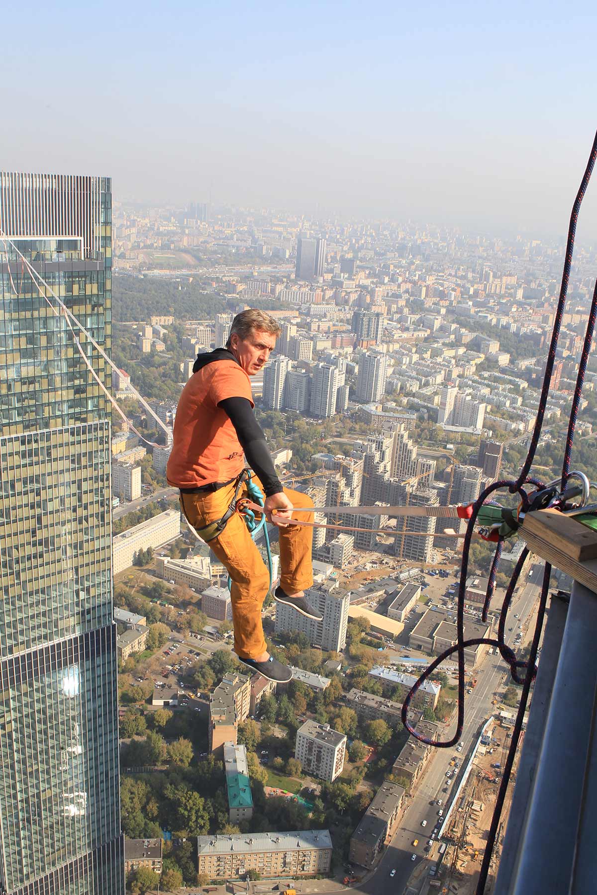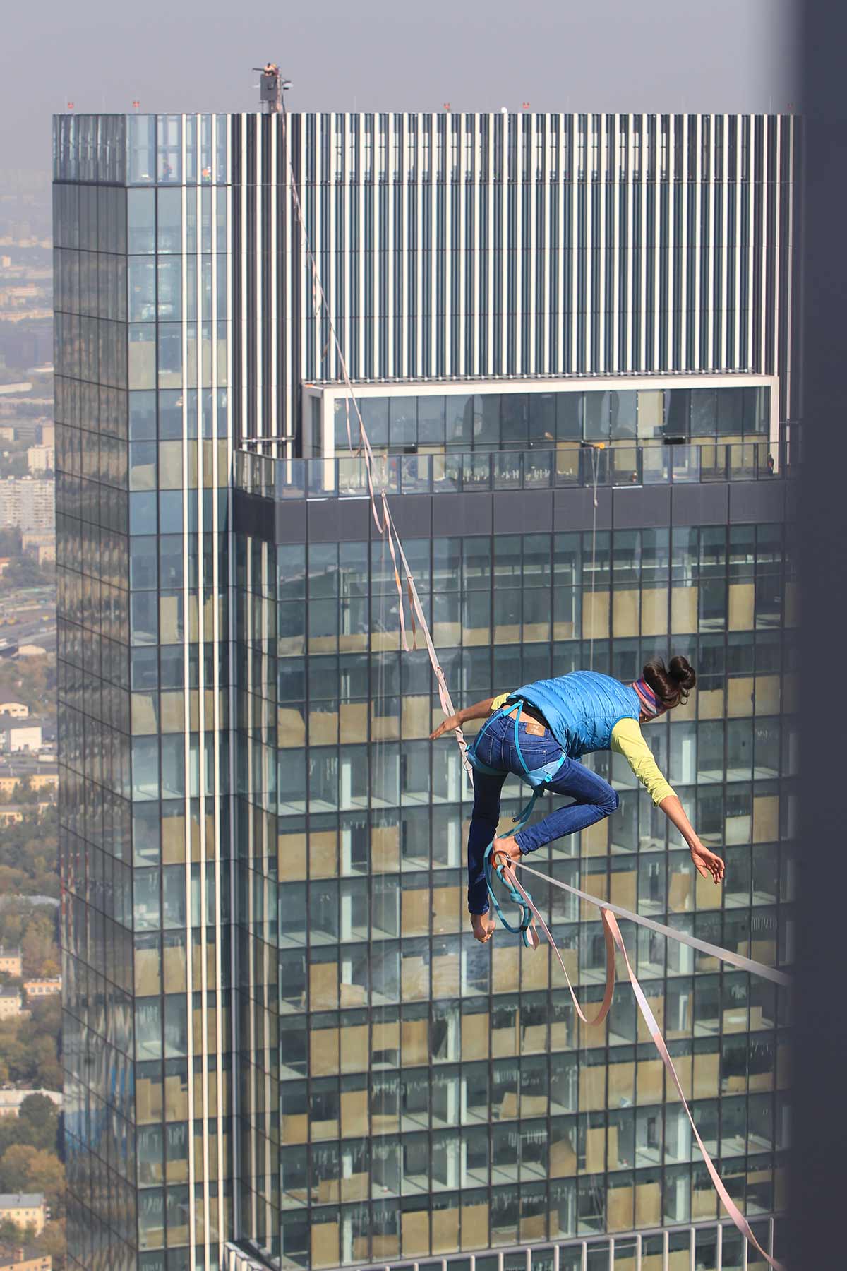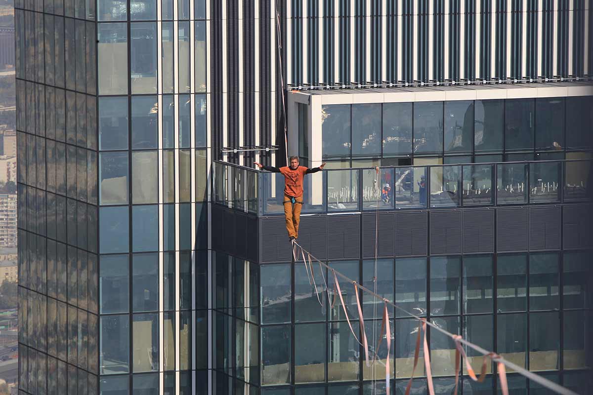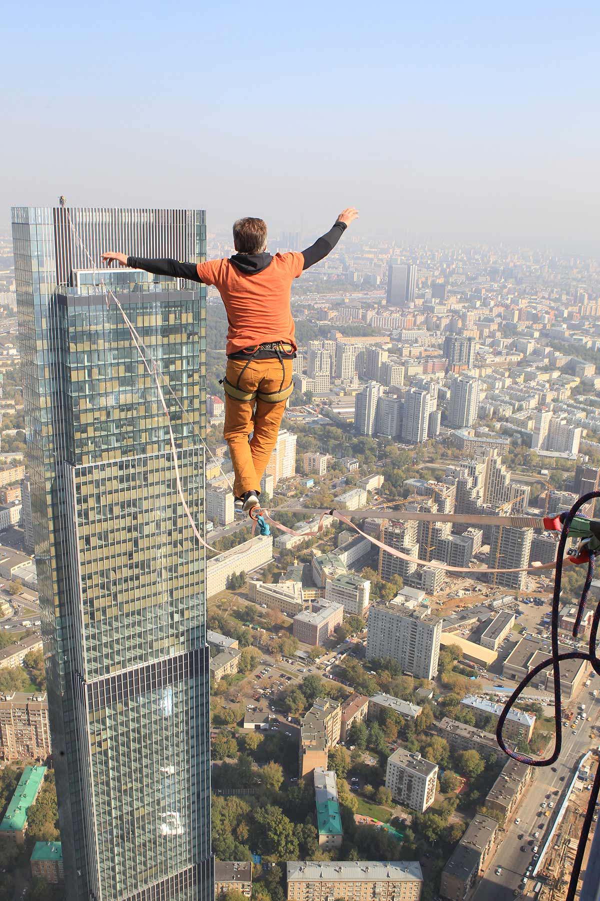 Нам с фотографом Русланом Вороным удалось побывать на одной из тренировок спортсменов. То, что ребята делают, - за гранью возможного. У нас, зрителей, спрятавшихся за тройным стеклом на 89 этаже, - голова кругом и холодок в животе. А эти безбашенные разуваются, цепляют страховку (слава богу, это обязательное требование) и шагают буквально в некуда - на «веревку» в 2,5 см шириной. Иногда оступаются – заголовки появившейся накануне новости, сообщившей, что «канатоходец сорвался с троса между небоскребами», могли довести до инфаркта тех, кто не посвящен в суть дела. Но падения - рутинная часть тренировочного процесса, рассказал наш самый опытный спортсмен Геннадий Скрипко. Система безопасности фиксирует надежно, так что улететь вниз со стропы невозможно. Важно другое: повиснув на страховочном троссе, собраться с силами, подтянуться над пропастью и снова встать на стропу по силам лишь самым упертым и смелым. Впрочем, этому можно научиться: в столичной школе каскадеров «Мастер» на Сетуни азы хайлайнинга помогут освоить даже детям.