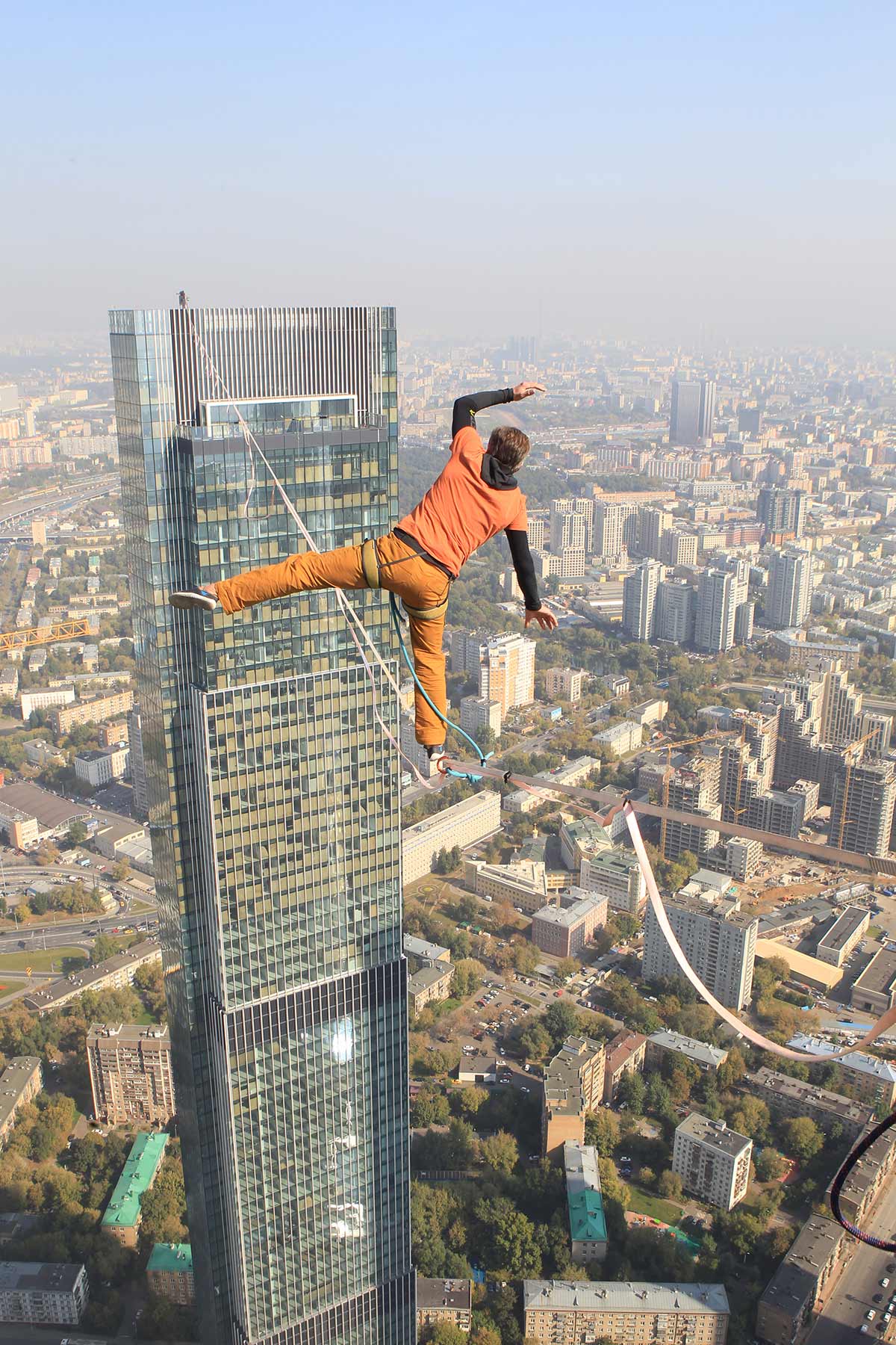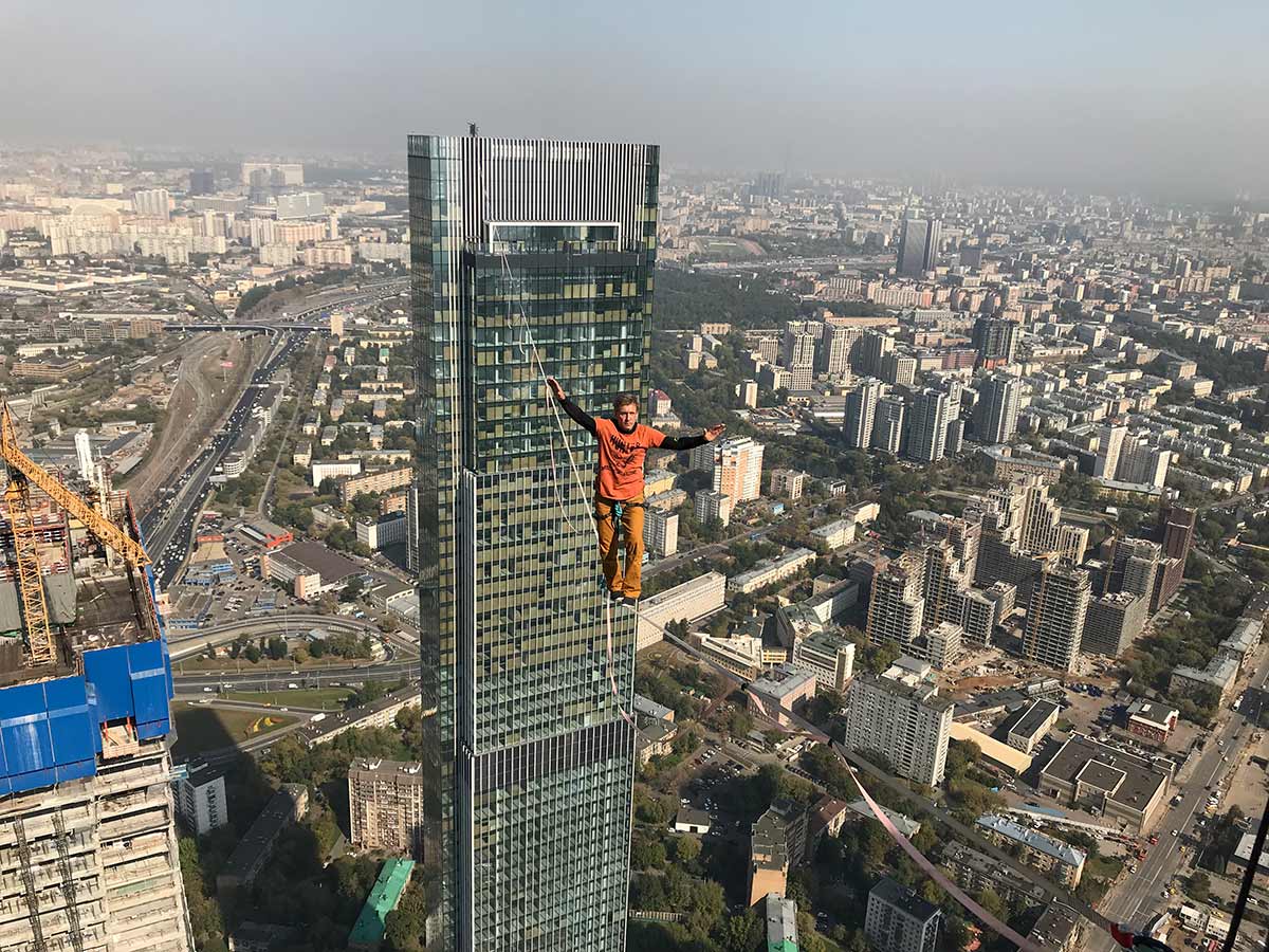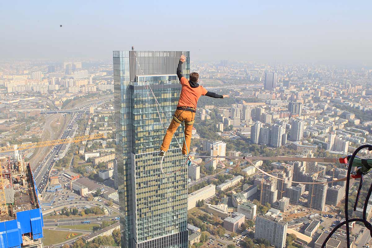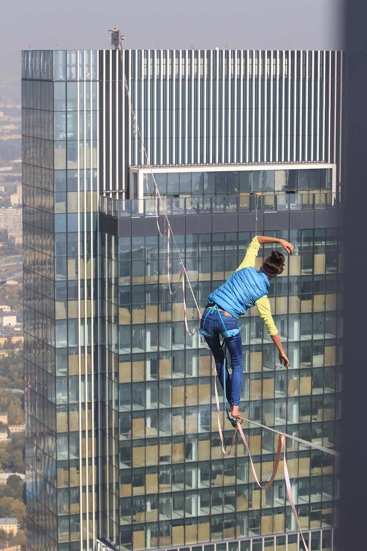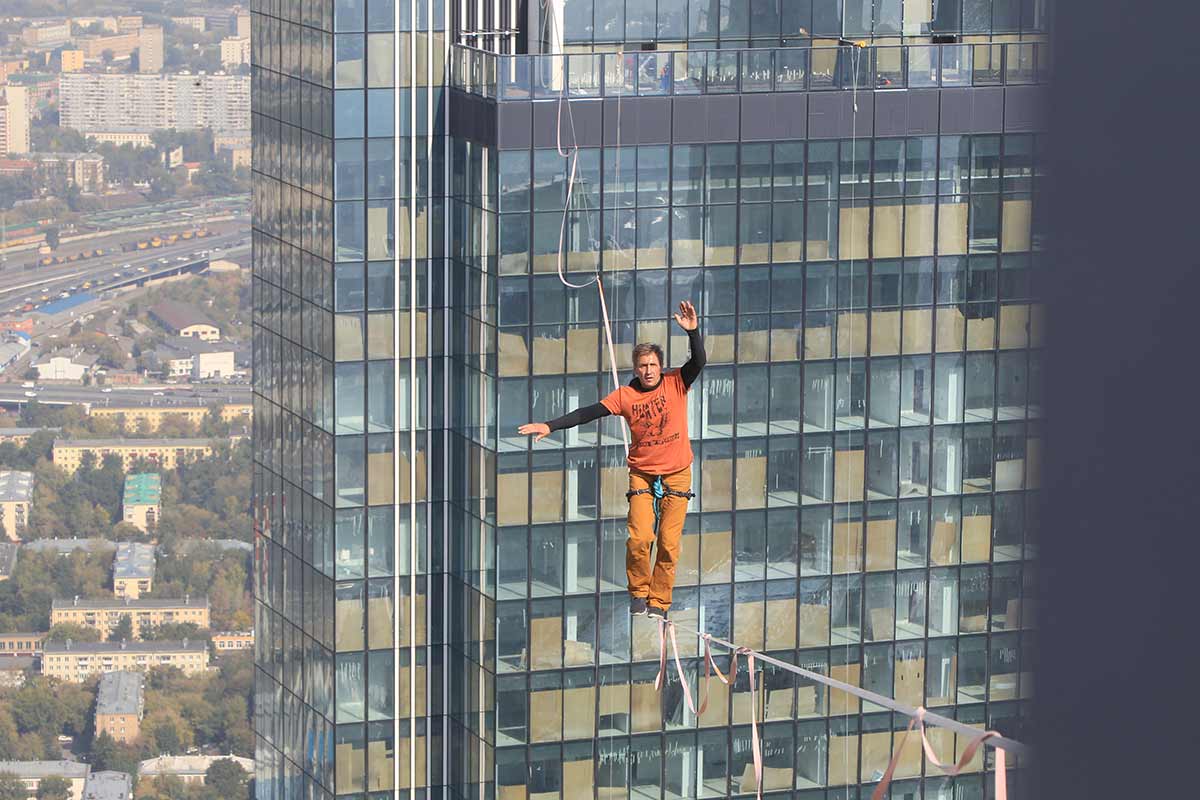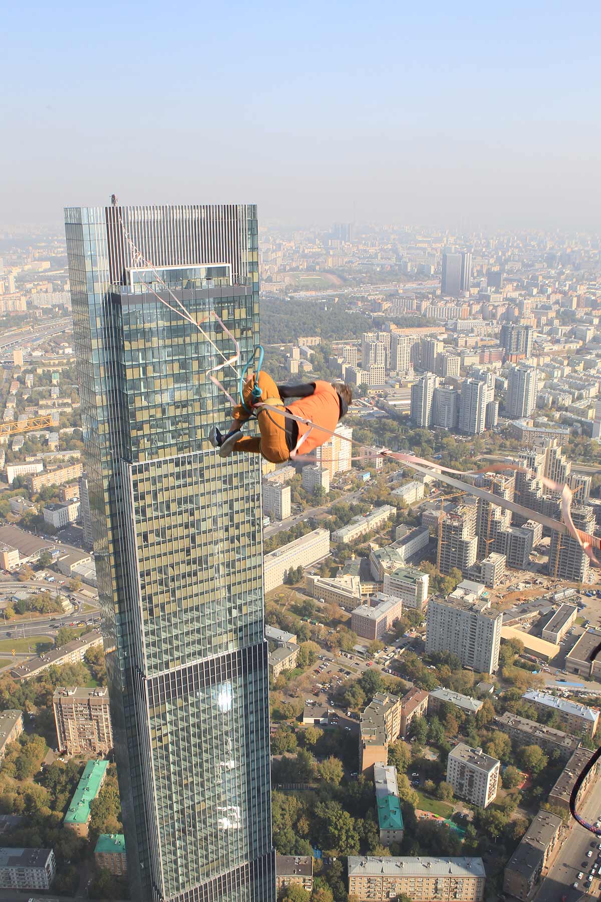 Нам с фотографом Русланом Вороным удалось побывать на одной из тренировок спортсменов. То, что ребята делают, - за гранью возможного. У нас, зрителей, спрятавшихся за тройным стеклом на 89 этаже, - голова кругом и холодок в животе. А эти безбашенные разуваются, цепляют страховку (слава богу, это обязательное требование) и шагают буквально в некуда - на «веревку» в 2,5 см шириной. Иногда оступаются – заголовки появившейся накануне новости, сообщившей, что «канатоходец сорвался с троса между небоскребами», могли довести до инфаркта тех, кто не посвящен в суть дела. Но падения - рутинная часть тренировочного процесса, рассказал наш самый опытный спортсмен Геннадий Скрипко. Система безопасности фиксирует надежно, так что улететь вниз со стропы невозможно. Важно другое: повиснув на страховочном троссе, собраться с силами, подтянуться над пропастью и снова встать на стропу по силам лишь самым упертым и смелым. Впрочем, этому можно научиться: в столичной школе каскадеров «Мастер» на Сетуни азы хайлайнинга помогут освоить даже детям.