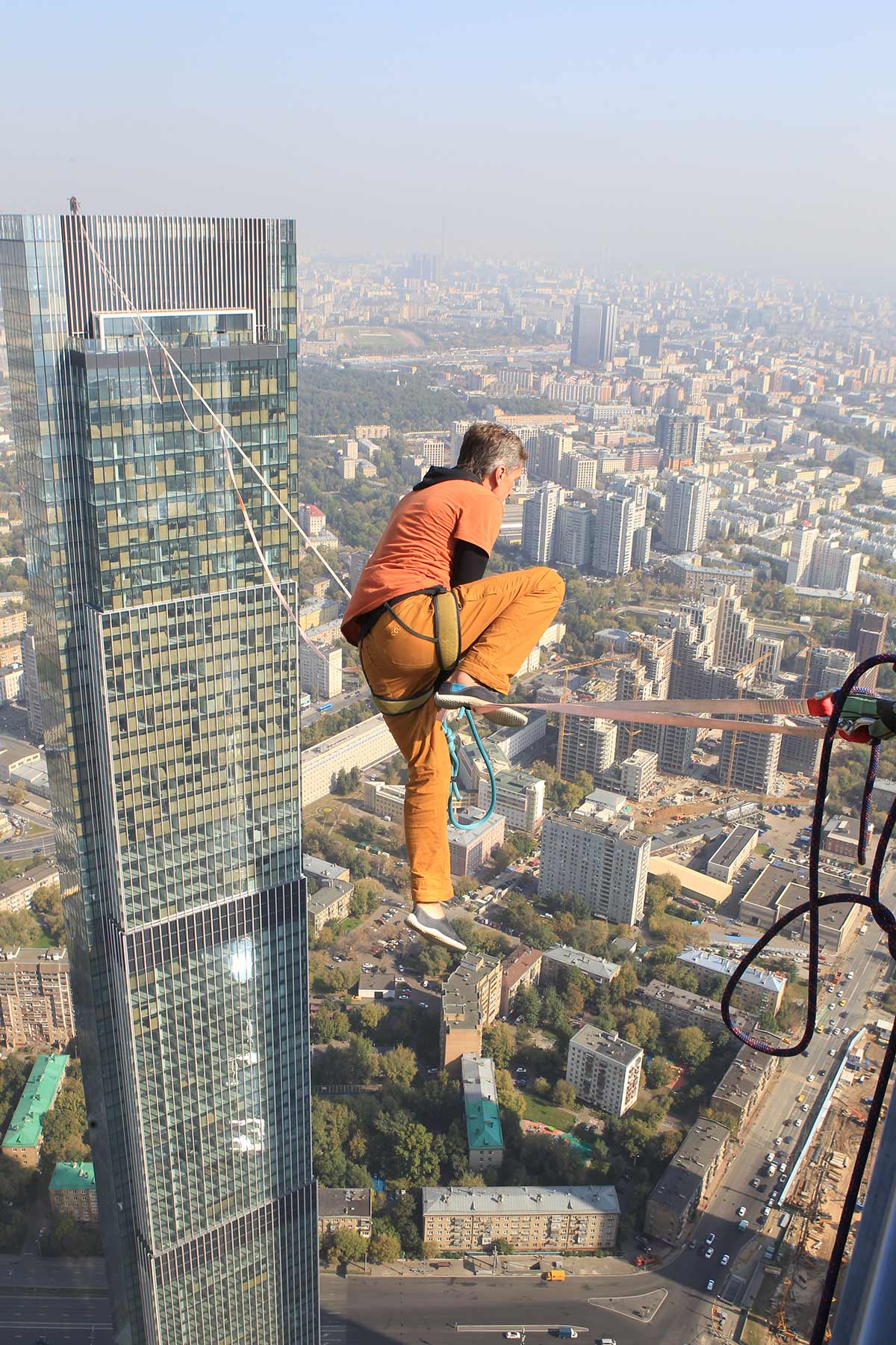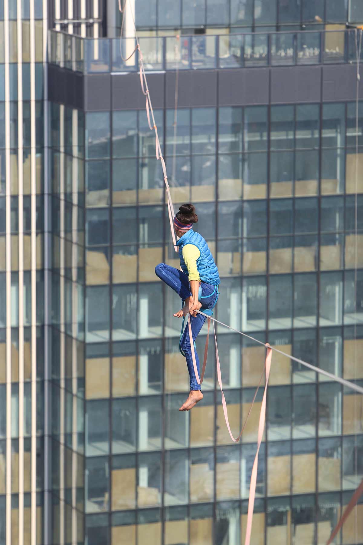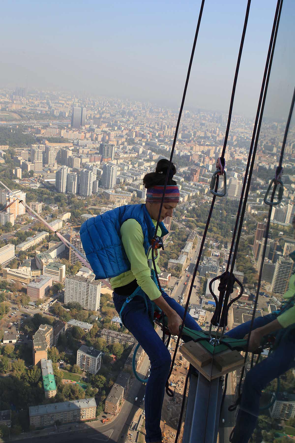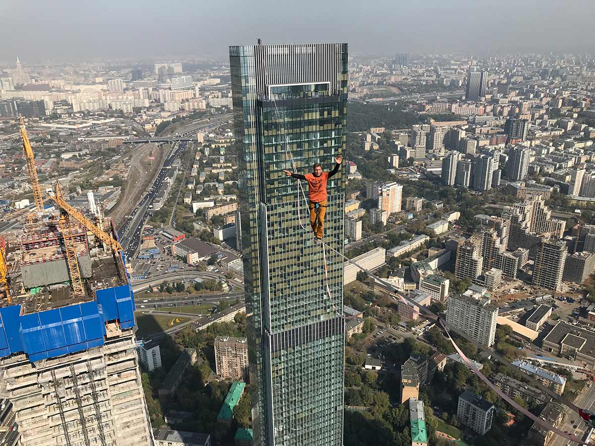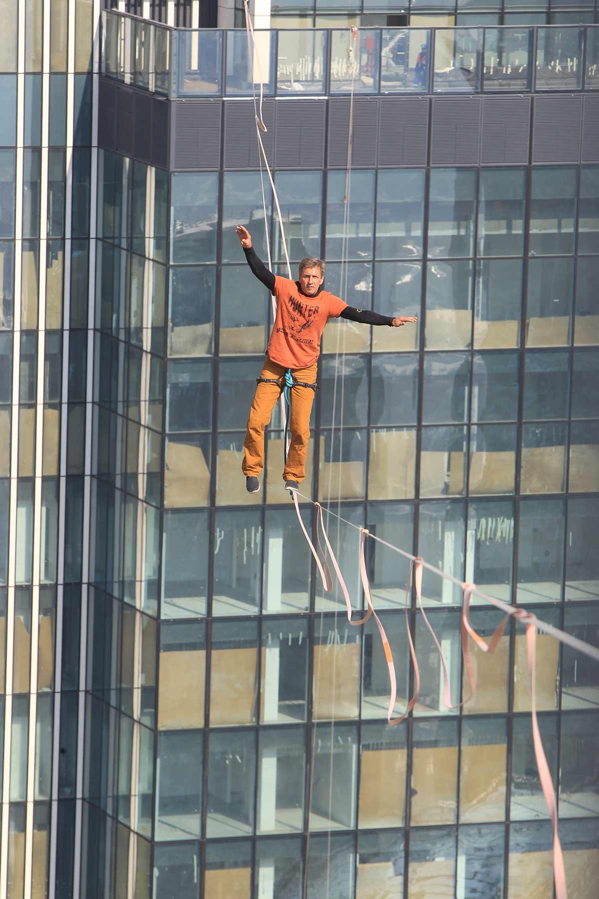 Нам с фотографом Русланом Вороным удалось побывать на одной из тренировок спортсменов. То, что ребята делают, - за гранью возможного. У нас, зрителей, спрятавшихся за тройным стеклом на 89 этаже, - голова кругом и холодок в животе. А эти безбашенные разуваются, цепляют страховку (слава богу, это обязательное требование) и шагают буквально в некуда - на «веревку» в 2,5 см шириной. Иногда оступаются – заголовки появившейся накануне новости, сообщившей, что «канатоходец сорвался с троса между небоскребами», могли довести до инфаркта тех, кто не посвящен в суть дела. Но падения - рутинная часть тренировочного процесса, рассказал наш самый опытный спортсмен Геннадий Скрипко. Система безопасности фиксирует надежно, так что улететь вниз со стропы невозможно. Важно другое: повиснув на страховочном троссе, собраться с силами, подтянуться над пропастью и снова встать на стропу по силам лишь самым упертым и смелым. Впрочем, этому можно научиться: в столичной школе каскадеров «Мастер» на Сетуни азы хайлайнинга помогут освоить даже детям.
