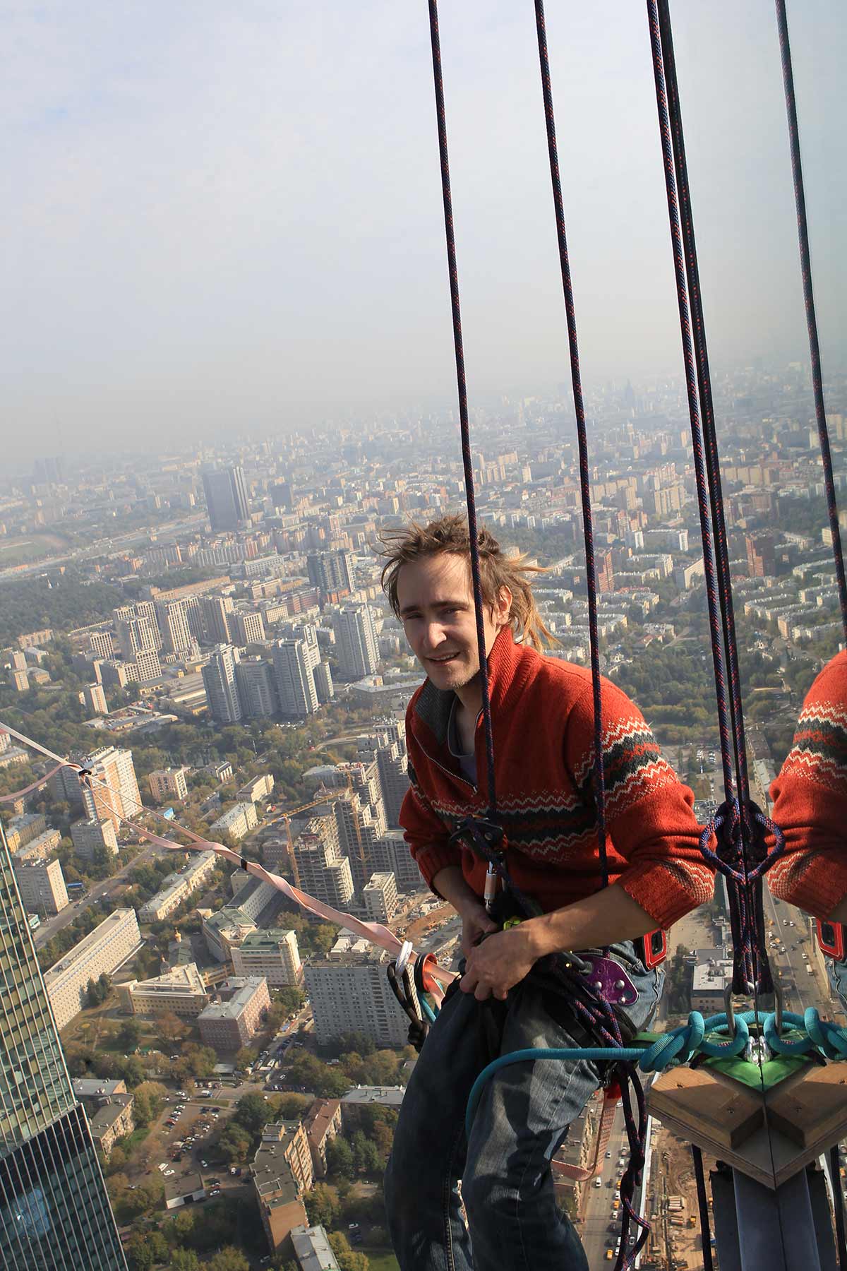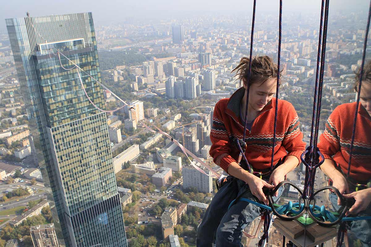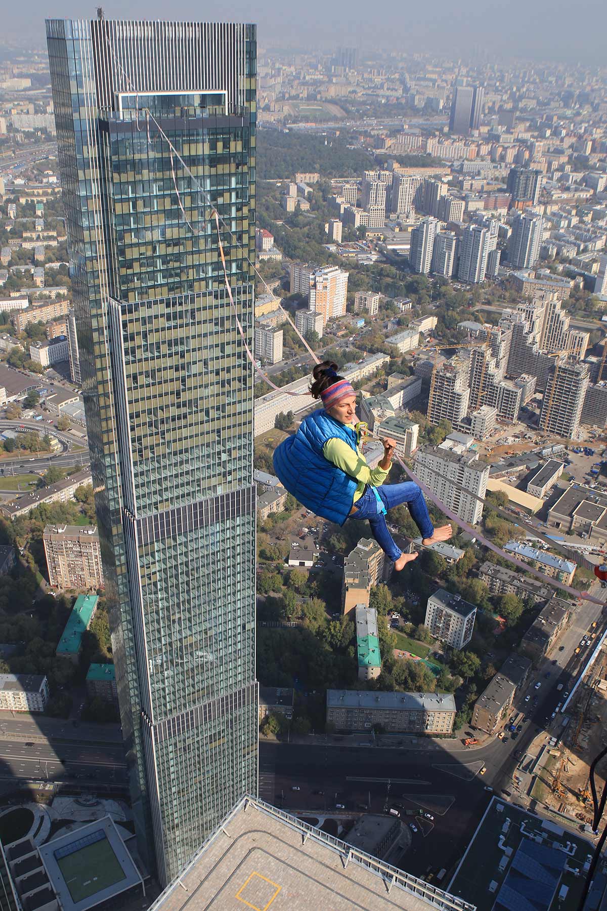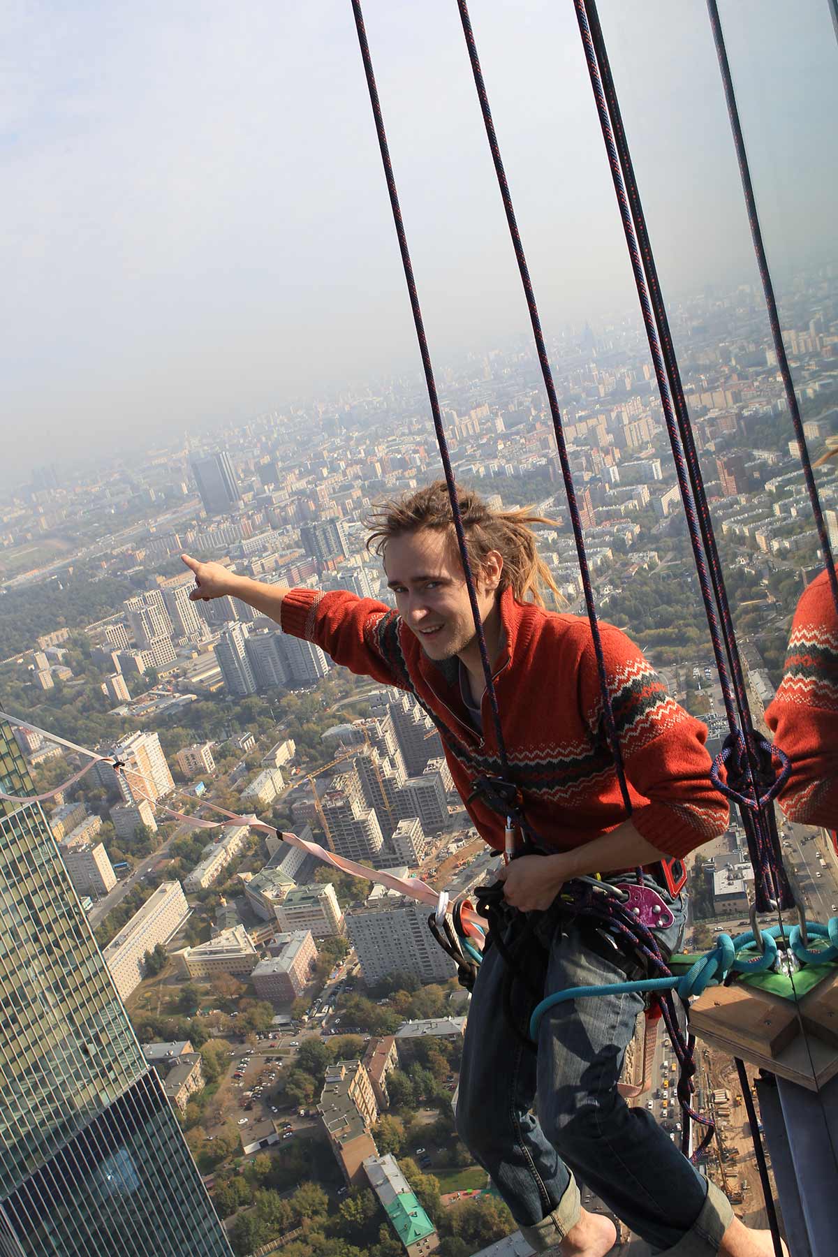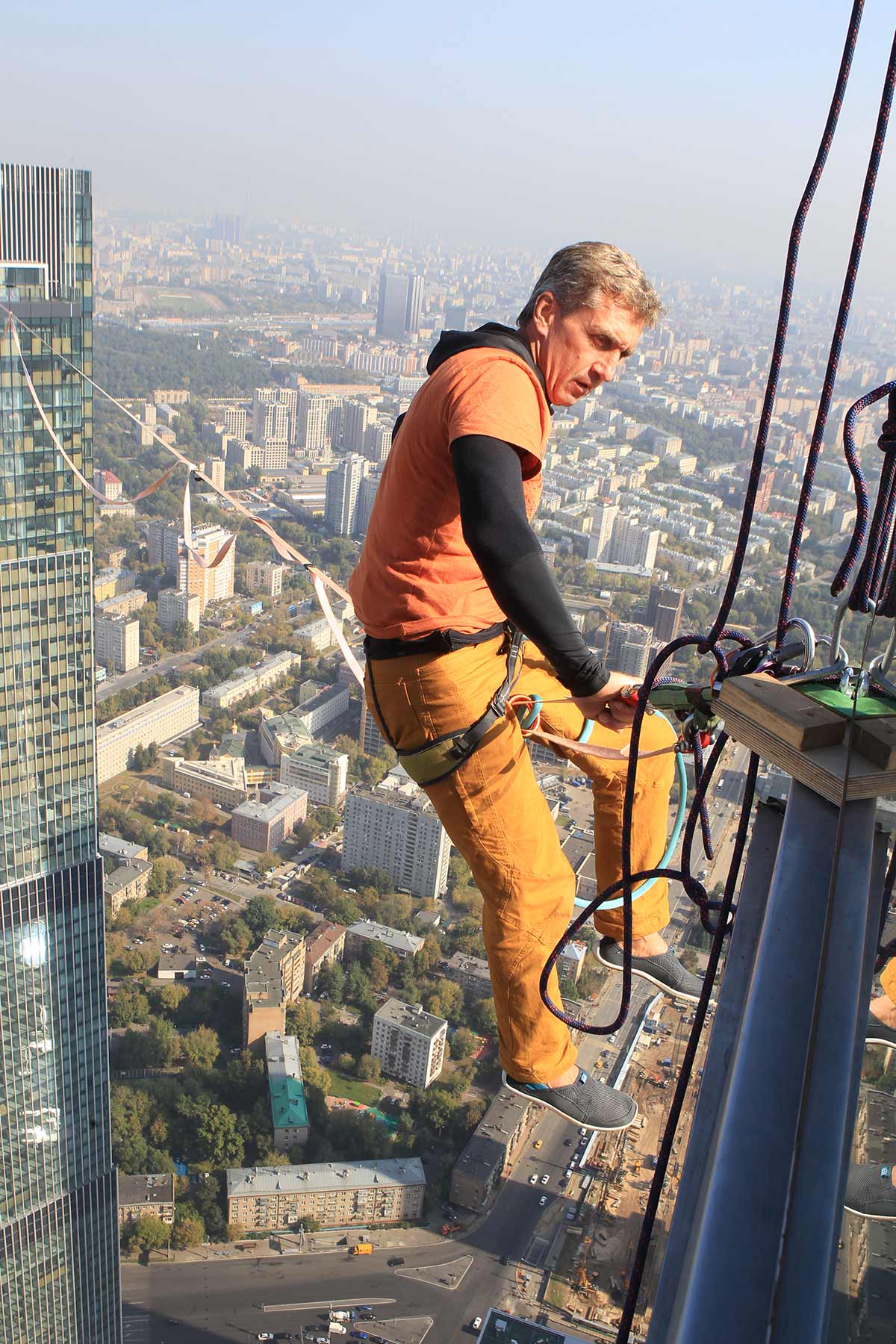 Нам с фотографом Русланом Вороным удалось побывать на одной из тренировок спортсменов. То, что ребята делают, - за гранью возможного. У нас, зрителей, спрятавшихся за тройным стеклом на 89 этаже, - голова кругом и холодок в животе. А эти безбашенные разуваются, цепляют страховку (слава богу, это обязательное требование) и шагают буквально в некуда - на «веревку» в 2,5 см шириной. Иногда оступаются – заголовки появившейся накануне новости, сообщившей, что «канатоходец сорвался с троса между небоскребами», могли довести до инфаркта тех, кто не посвящен в суть дела. Но падения - рутинная часть тренировочного процесса, рассказал наш самый опытный спортсмен Геннадий Скрипко. Система безопасности фиксирует надежно, так что улететь вниз со стропы невозможно. Важно другое: повиснув на страховочном троссе, собраться с силами, подтянуться над пропастью и снова встать на стропу по силам лишь самым упертым и смелым. Впрочем, этому можно научиться: в столичной школе каскадеров «Мастер» на Сетуни азы хайлайнинга помогут освоить даже детям.