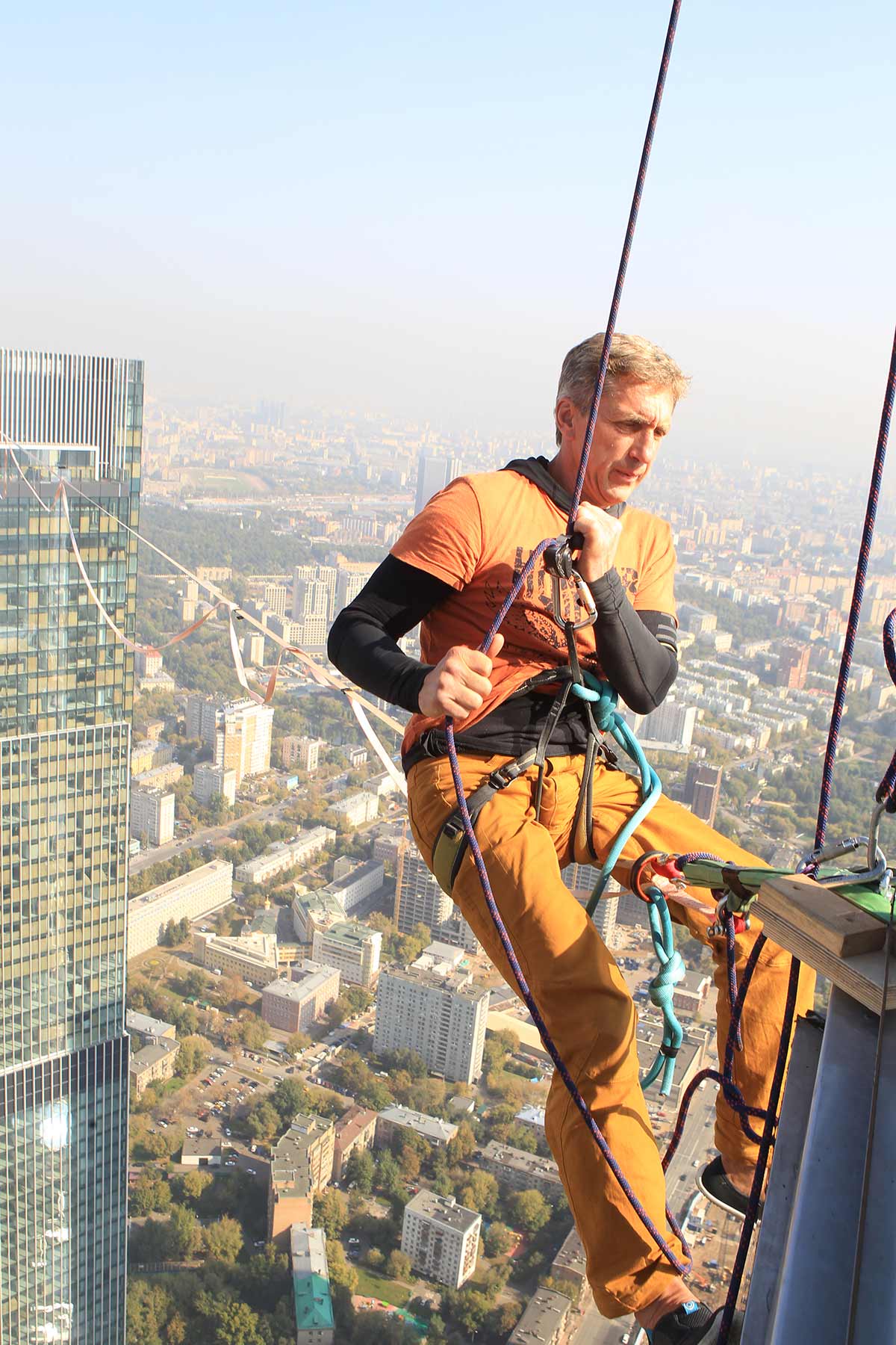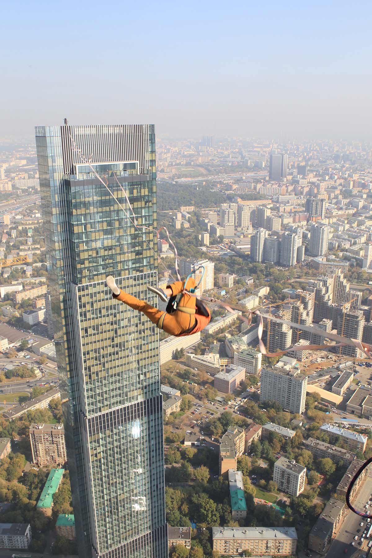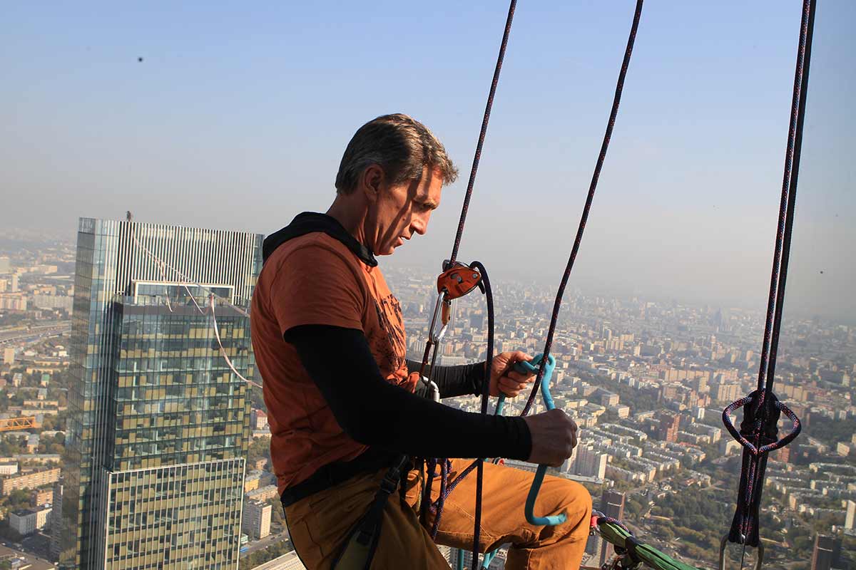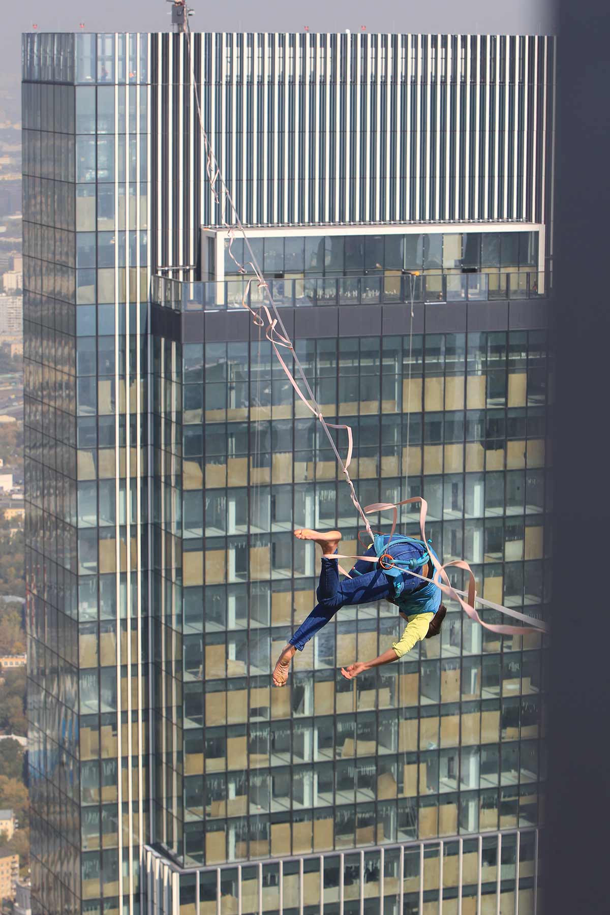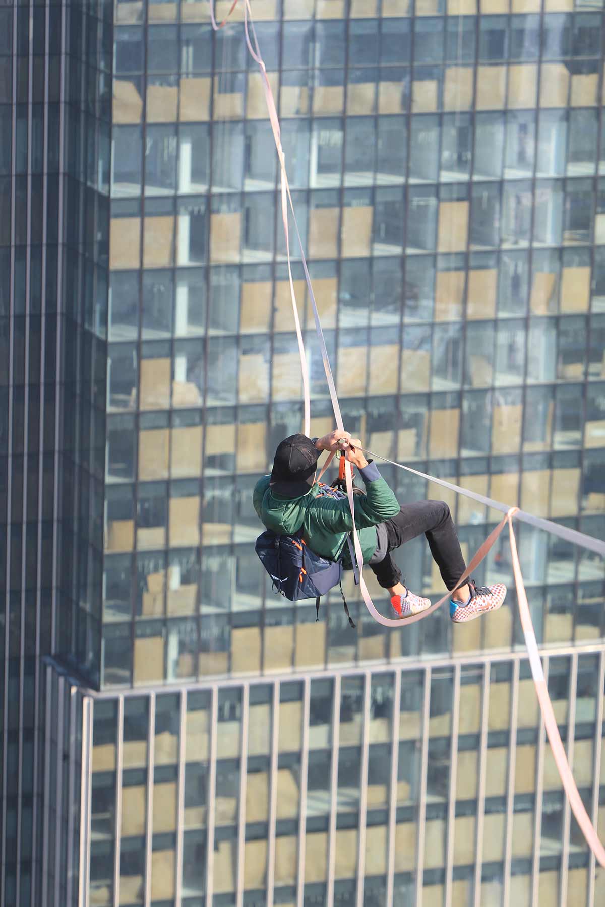 Нам с фотографом Русланом Вороным удалось побывать на одной из тренировок спортсменов. То, что ребята делают, - за гранью возможного. У нас, зрителей, спрятавшихся за тройным стеклом на 89 этаже, - голова кругом и холодок в животе. А эти безбашенные разуваются, цепляют страховку (слава богу, это обязательное требование) и шагают буквально в некуда - на «веревку» в 2,5 см шириной. Иногда оступаются – заголовки появившейся накануне новости, сообщившей, что «канатоходец сорвался с троса между небоскребами», могли довести до инфаркта тех, кто не посвящен в суть дела. Но падения - рутинная часть тренировочного процесса, рассказал наш самый опытный спортсмен Геннадий Скрипко. Система безопасности фиксирует надежно, так что улететь вниз со стропы невозможно. Важно другое: повиснув на страховочном троссе, собраться с силами, подтянуться над пропастью и снова встать на стропу по силам лишь самым упертым и смелым. Впрочем, этому можно научиться: в столичной школе каскадеров «Мастер» на Сетуни азы хайлайнинга помогут освоить даже детям.