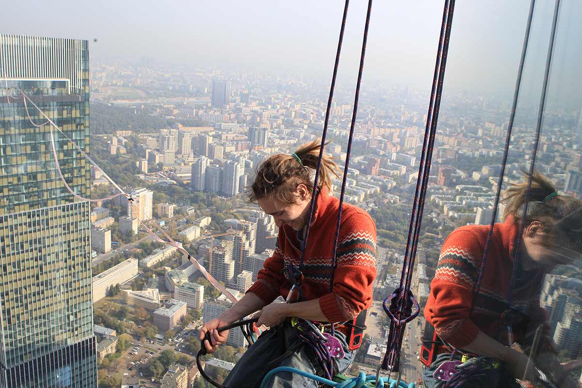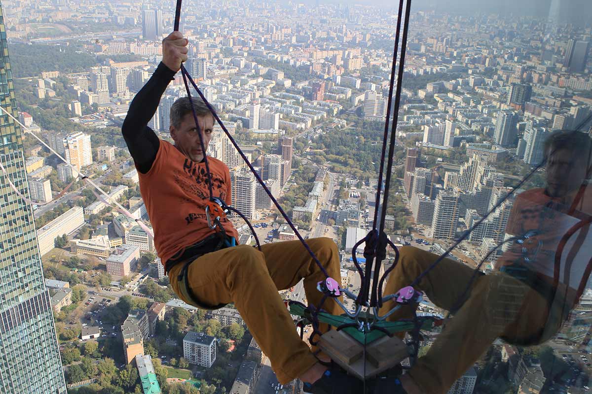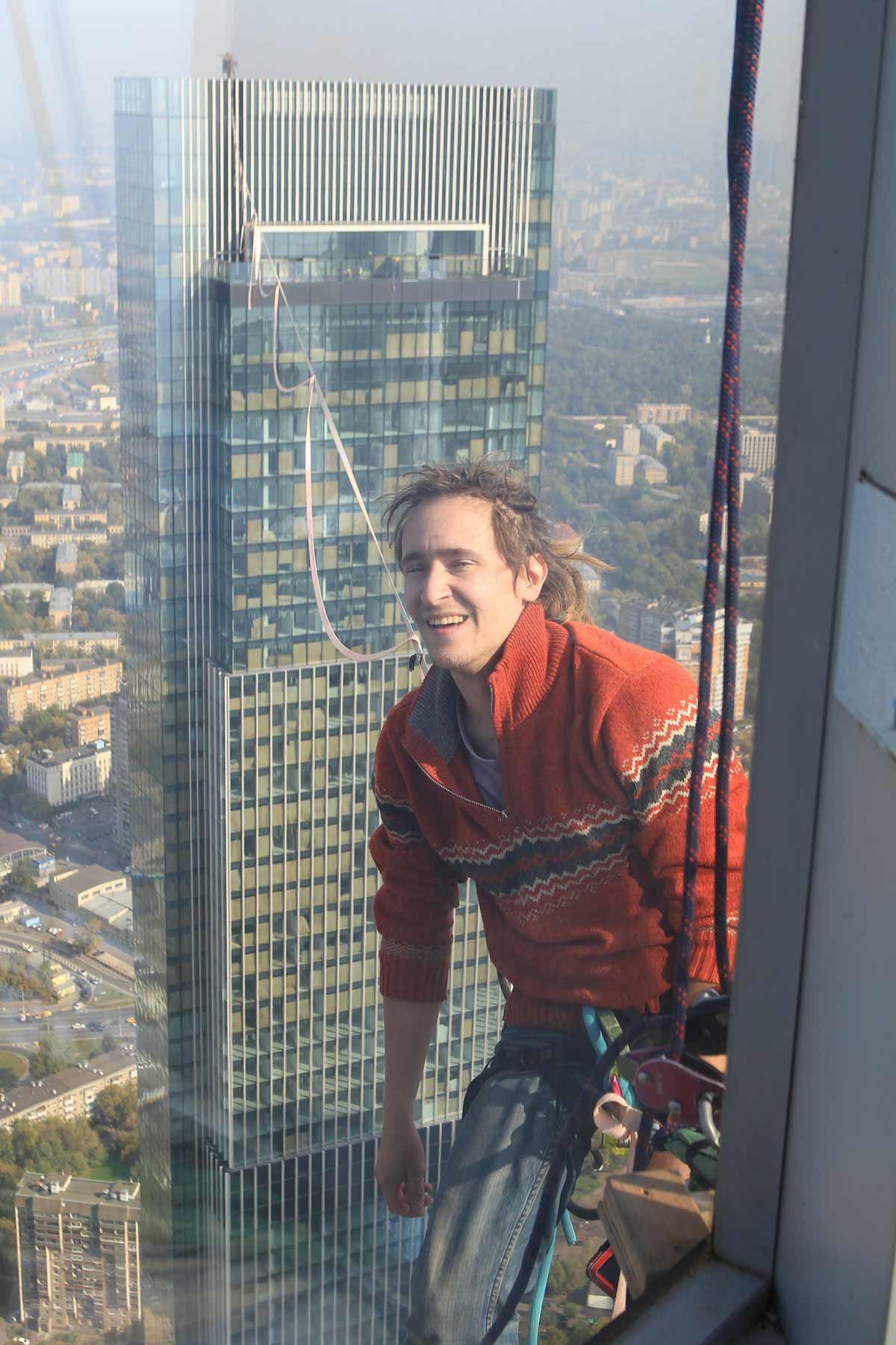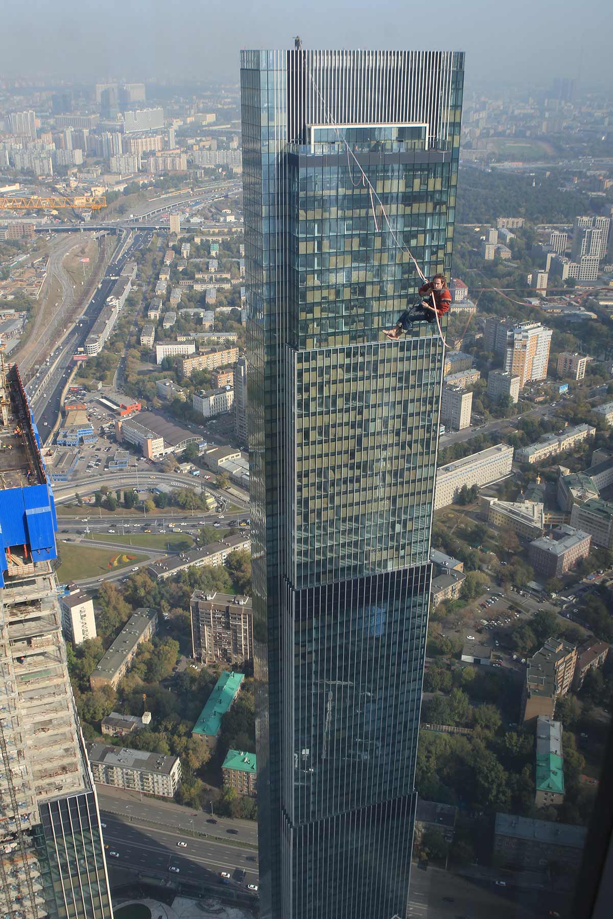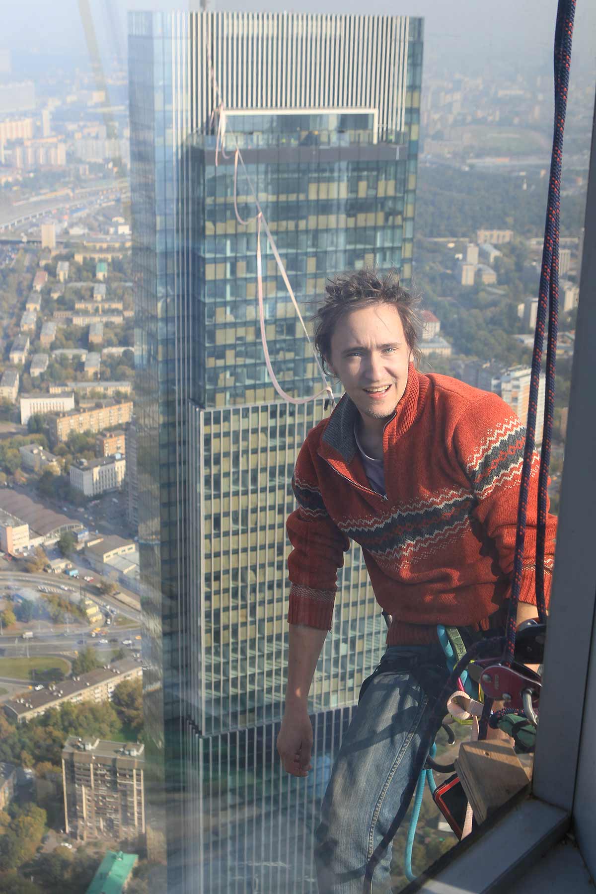 Нам с фотографом Русланом Вороным удалось побывать на одной из тренировок спортсменов. То, что ребята делают, - за гранью возможного. У нас, зрителей, спрятавшихся за тройным стеклом на 89 этаже, - голова кругом и холодок в животе. А эти безбашенные разуваются, цепляют страховку (слава богу, это обязательное требование) и шагают буквально в некуда - на «веревку» в 2,5 см шириной. Иногда оступаются – заголовки появившейся накануне новости, сообщившей, что «канатоходец сорвался с троса между небоскребами», могли довести до инфаркта тех, кто не посвящен в суть дела. Но падения - рутинная часть тренировочного процесса, рассказал наш самый опытный спортсмен Геннадий Скрипко. Система безопасности фиксирует надежно, так что улететь вниз со стропы невозможно. Важно другое: повиснув на страховочном троссе, собраться с силами, подтянуться над пропастью и снова встать на стропу по силам лишь самым упертым и смелым. Впрочем, этому можно научиться: в столичной школе каскадеров «Мастер» на Сетуни азы хайлайнинга помогут освоить даже детям.