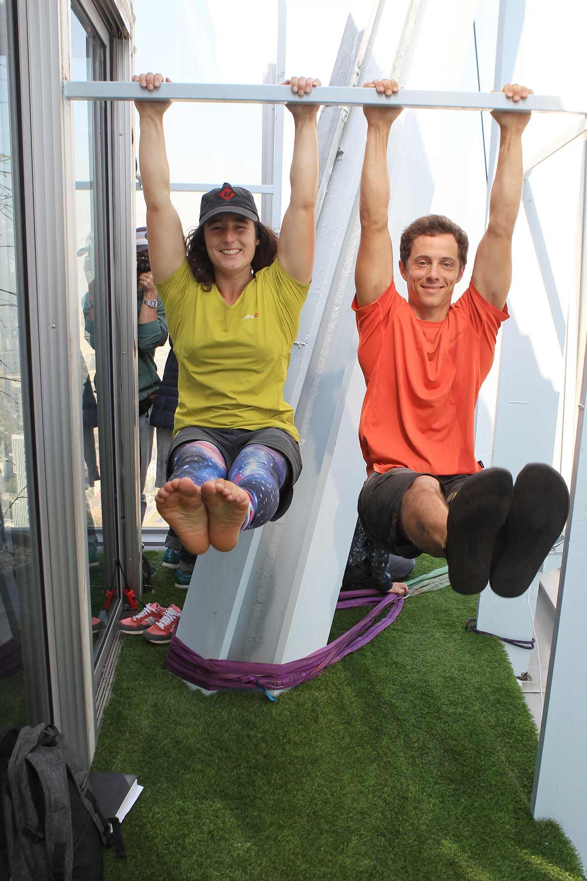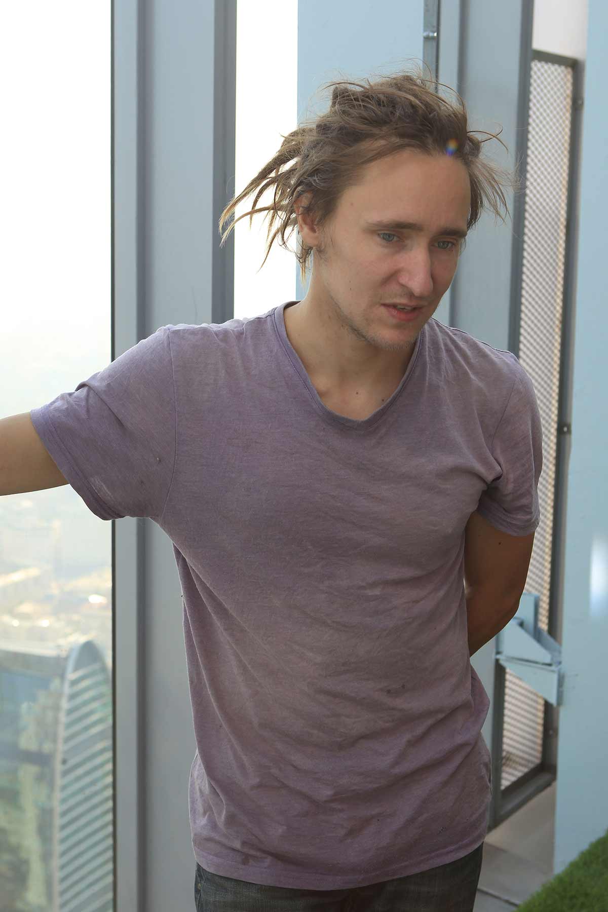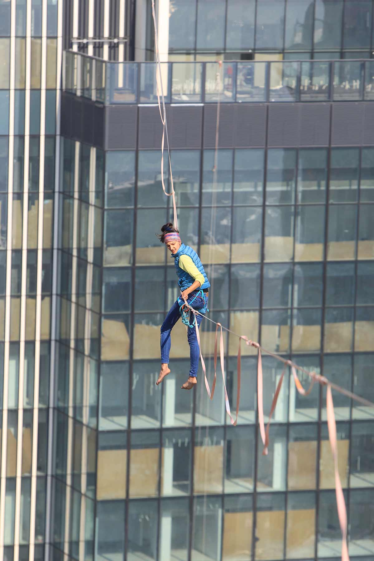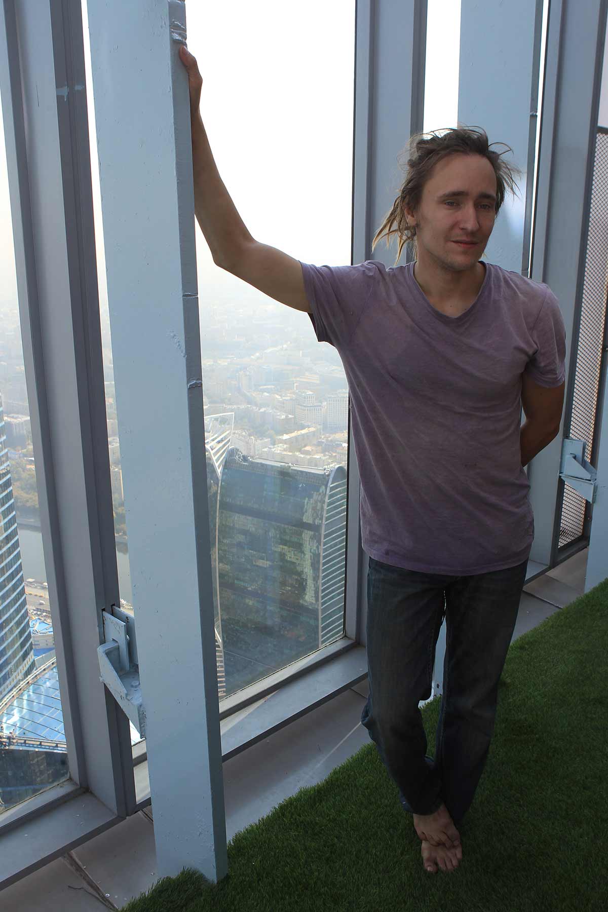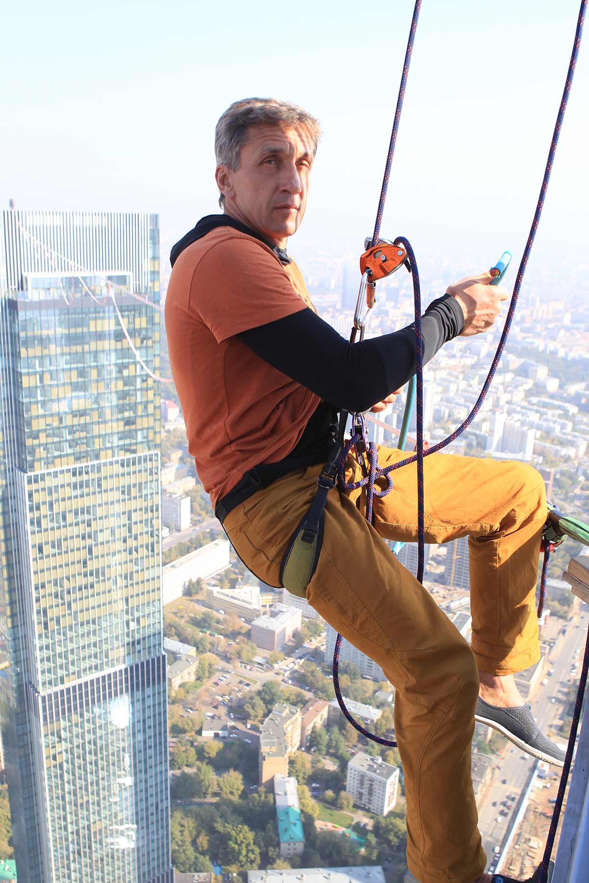 Нам с фотографом Русланом Вороным удалось побывать на одной из тренировок спортсменов. То, что ребята делают, - за гранью возможного. У нас, зрителей, спрятавшихся за тройным стеклом на 89 этаже, - голова кругом и холодок в животе. А эти безбашенные разуваются, цепляют страховку (слава богу, это обязательное требование) и шагают буквально в некуда - на «веревку» в 2,5 см шириной. Иногда оступаются – заголовки появившейся накануне новости, сообщившей, что «канатоходец сорвался с троса между небоскребами», могли довести до инфаркта тех, кто не посвящен в суть дела. Но падения - рутинная часть тренировочного процесса, рассказал наш самый опытный спортсмен Геннадий Скрипко. Система безопасности фиксирует надежно, так что улететь вниз со стропы невозможно. Важно другое: повиснув на страховочном троссе, собраться с силами, подтянуться над пропастью и снова встать на стропу по силам лишь самым упертым и смелым. Впрочем, этому можно научиться: в столичной школе каскадеров «Мастер» на Сетуни азы хайлайнинга помогут освоить даже детям.