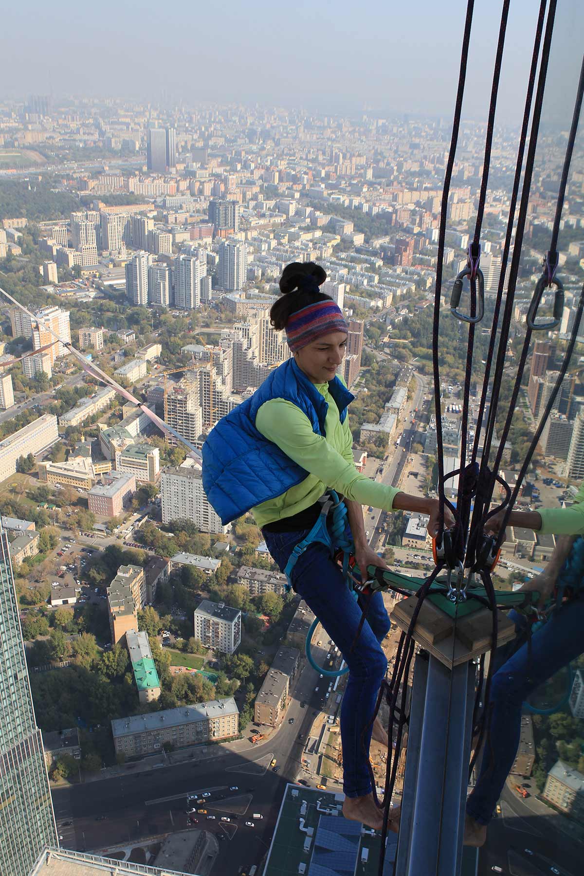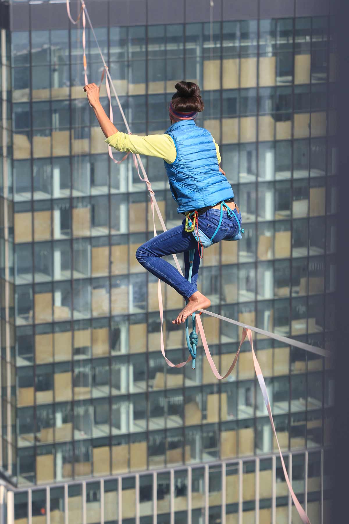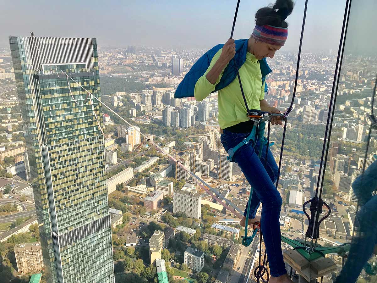 Среди хайлайнеров много женщин. В соревнованиях в Москве примет участие рекордсменка по длине хайлайна среди девушек, канадка Миа Нобле. Веселая, подвижная, с озорными кудряшками, на наших глазах она делает несколько переворотов на импровизированном турнике, и ты понимаешь, какая подготовка стоит за видимой легкостью, с которой она порхает по трассе.