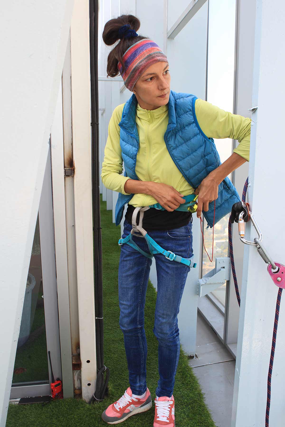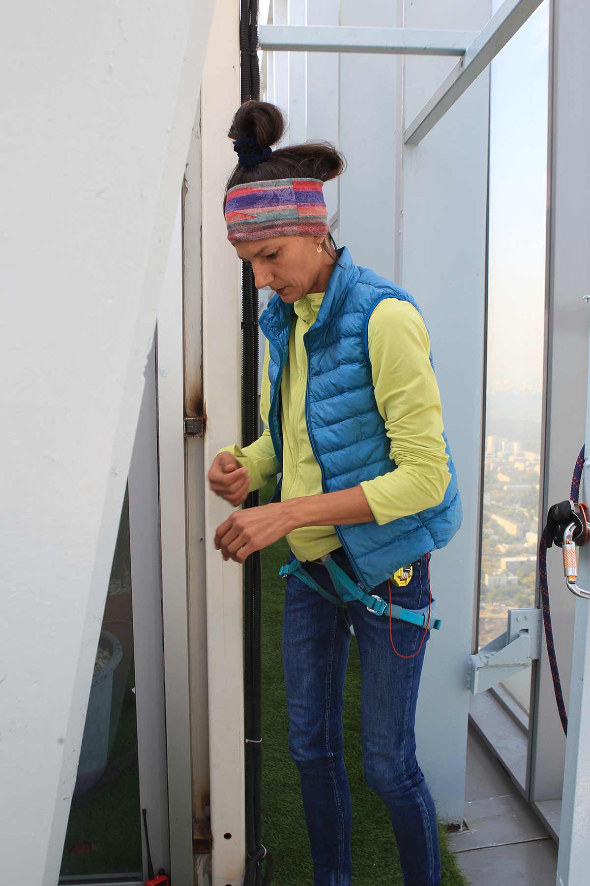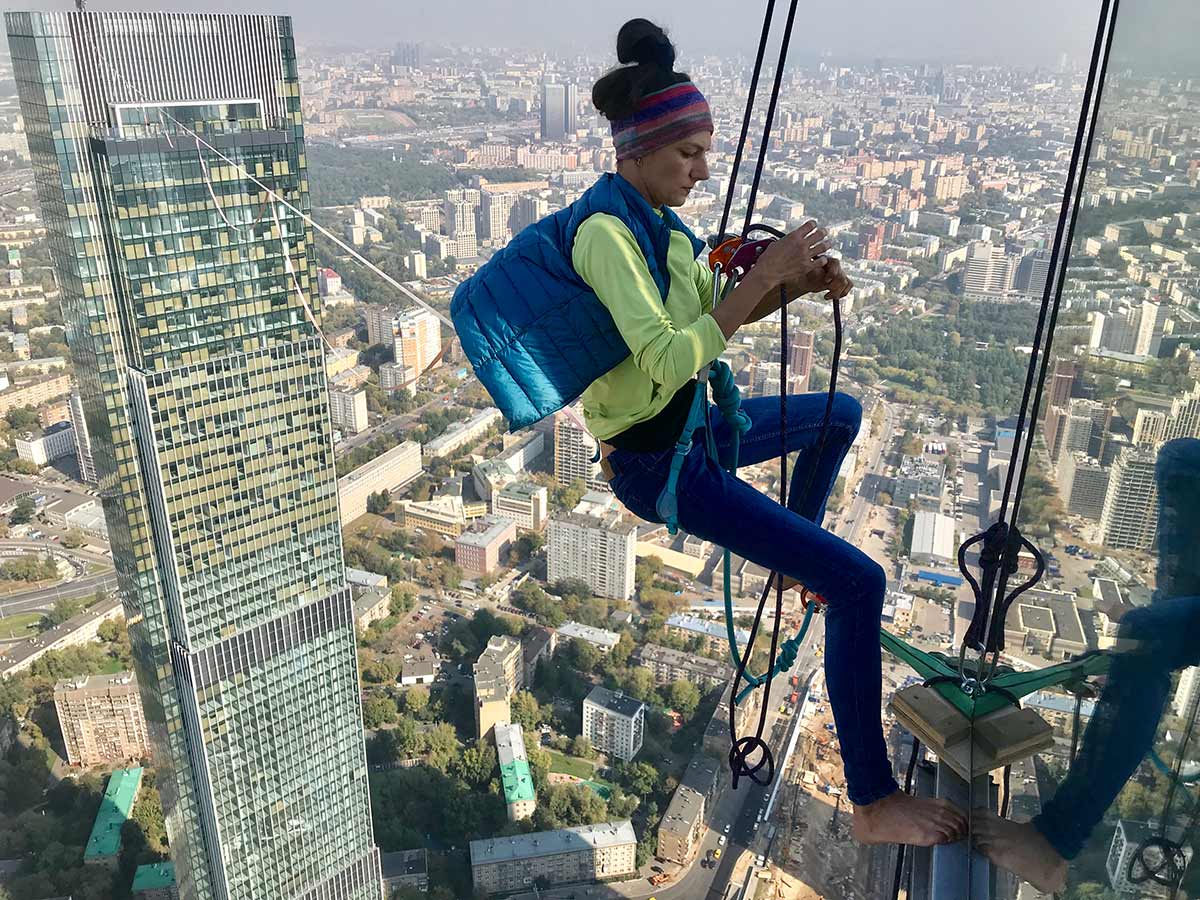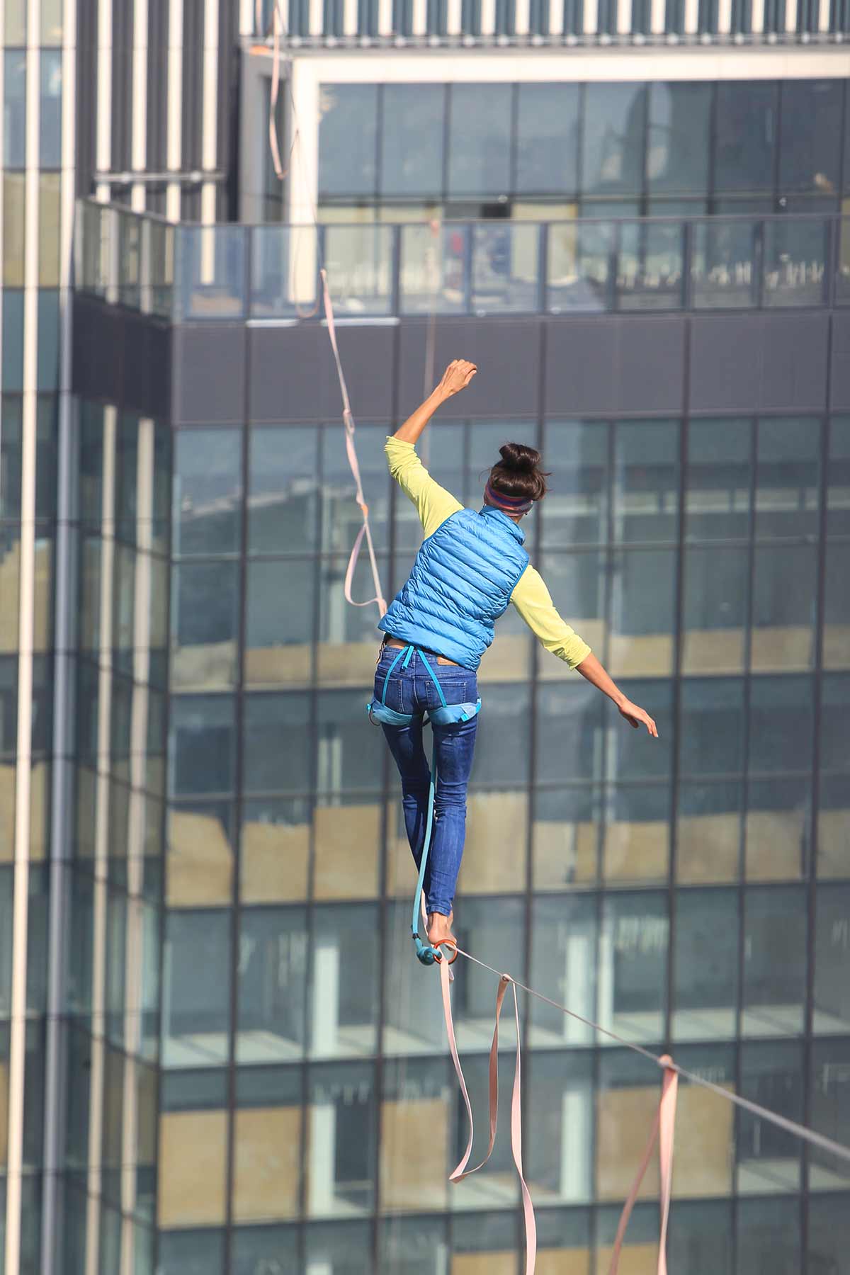Среди хайлайнеров много женщин. В соревнованиях в Москве примет участие рекордсменка по длине хайлайна среди девушек, канадка Миа Нобле. Веселая, подвижная, с озорными кудряшками, на наших глазах она делает несколько переворотов на импровизированном турнике, и ты понимаешь, какая подготовка стоит за видимой легкостью, с которой она порхает по трассе.