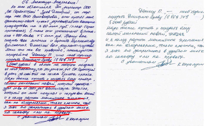 В качестве «доказательства» вины юриста Карамзина из его записки о буклете и вентиляторе была смонтирована подложная записка про iPhone. Невооруженным взглядом в ней видны следы топорной фальсификации: другой рукой печатными буквами в нужном месте вписано слово «IPHONE».