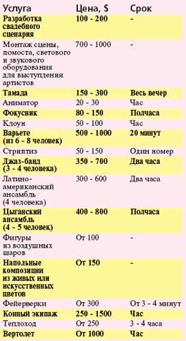 У компании «Star Show» другая «фишка» - за определенную сумму она доставит на ваше бракосочетание любую звезду шоу-бизнеса. От Кати Лель до Томаса Андерса. Еще более высокую планку держит продюсерский центр «Laplabel».