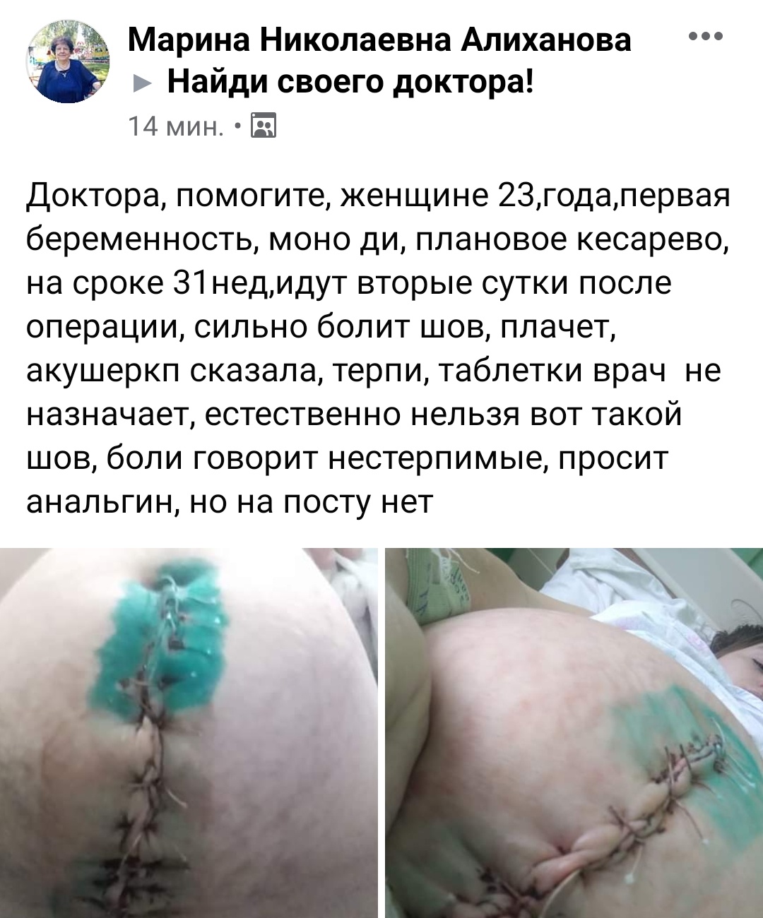 — Женщине 23 года, — написала Марина Николаевна. — Первая беременность. Моно ди (двойня). Плановое кесарево на сроке 31 неделя. Идут вторые сутки после операции: сильно болит шов, плачет. Акушерка сказала: «Терпи». Таблетки врач не назначает. Роженица говорит, что боли нестерпимые, просит анальгин, но на посту его нет.