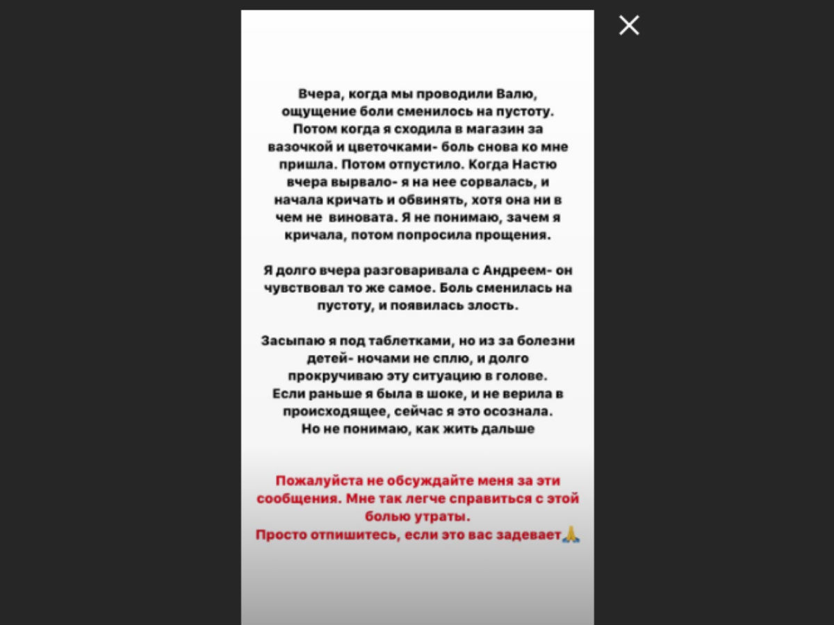 Также блогер пожаловалась на свои проблемы. «Тяжело, когда болеет 1 ребенок. Очень сложно — когда сразу 2. Просто невыносимо, когда ты потерял любимого + у тебя болеет 2 ребенка», — так свою «черную полосу» описала вдова. Она добавила, что никому не пожелает того, что испытывает сейчас.