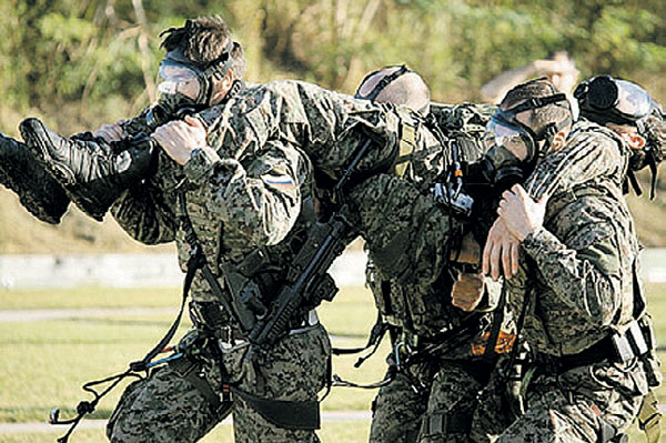 - Снайпер и четыре штурмовика подбегают к траверсу, над водой преодолевают препятствие с помощью роликов, затем стену или трубу, подбегают к огневой позиции и, надев противогазы, стреляют одиночными из автоматов (четыре патрона) по бумажным мишеням с дистанции 15 - 20 м.