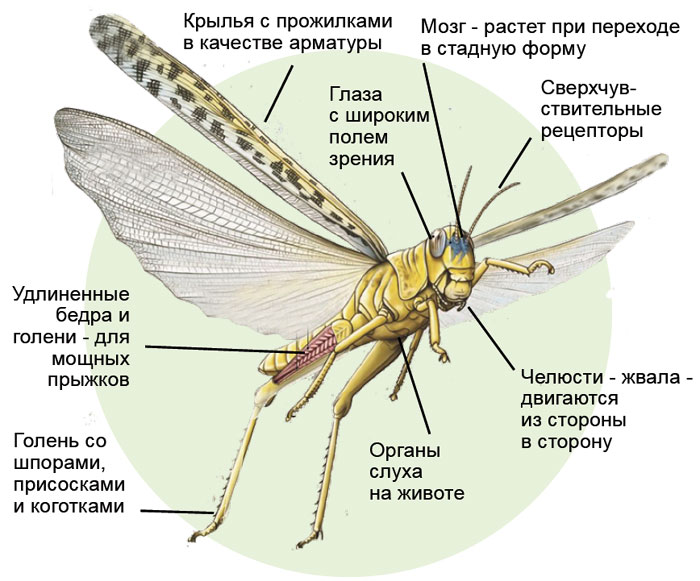 - Именно каннибализм заставляет саранчу двигаться с бешеной скоростью: оголодавшие акриды преследуют своих же более сытых сородичей.