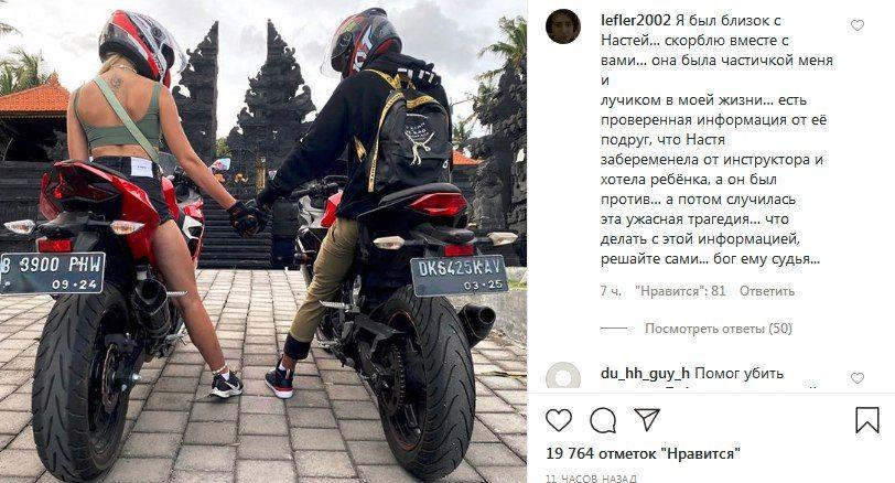 19-летняя блогер из России Настя Тропицель, трагически погибшая на Бали, была беременна. Друзья покойной утверждают, что девушка ждала ребенка от своего любовника – инструктора Виктора, который и научил ее ездить на мотоцикле. Причем, если верить приятелям Насти, мужчина становиться отцом не хотел.