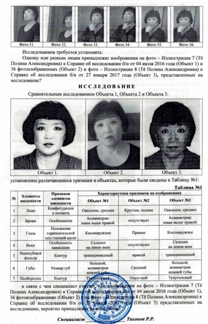 С 2015 года от имени Полины Тё в органы, суды, к приставам и т.д., стали ходить абсолютно разные женщины восточной наружности. Наталья Шертман показала нам фотографию с общегражданского паспорта Полины и фотки самозванок. «Посмотрите, все эти женщины приходят в суд по очереди и представляются Полиной Тё. Вот эта, самая горластая, общается с судебными приставами. Эти две ходят в арбитраж, видимо, у них есть экономическое образование, а эта участвует в уголовных делах. Семья у них большая – семь человек, шесть сестер, все кореянки, замужем за корейцами, дети корейцы, и седьмой - Сергей Тё, женатый на русской. Так вот, все женщины восточной наружности, с которыми приходилось сталкиваться, не похожи даже между собой. Разные фигуры, разный вес, разная грудь... Одна высокая, другая ногами до пола не достает, сидя на скамейке в судах, у одной волосы выстрижены вокруг ушей, у другой закрывают. Одну из них даже задержали в августе 2019 года в помещении Зеленоградского районного суда г. Москвы. Но пока она следовала с полицейскими до отдела, «потеряла» где-то паспорт и «забыла» как расписывается, где живет, какое у нее образование. Ей удалось уйти из полицейского участка, начальником которого, со слов Савкина Сергея , доверенного лица семьи Тё, оказался его далекий родственник. И этот цирк с подставными тетками продолжается до сих пор. Я уж не говорю о том, что все подписи на документах о создании юридических лиц, на заявлениях в правоохранительные органы, суды и т.д. фальшивые. Это доказывают многочисленные почерковедческие исследования и независимые экспертизы».