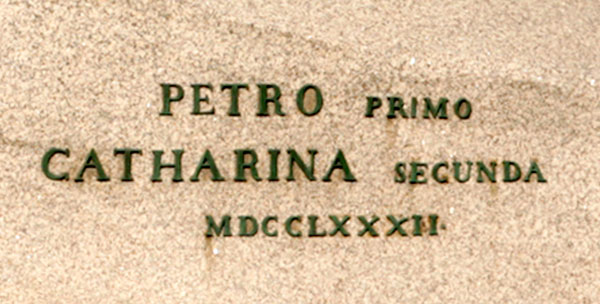 Есть данные, что надпись («ПЕТРУ перьвому ЕКАТЕРИНА вторая лѣта 1782» кириллицей справа и на латыни слева) по просьбе Екатерины II придумал поэт Барков - гуляка и автор «срамных од». За удачную идею он получил хороший гонорар - 100 руб. серебром. Через несколько дней друзья спросили у поэта, во что вложил такую сумму, на что Иван доложил в стихах: 93 рубля - на водку, 7 - на проституток.
