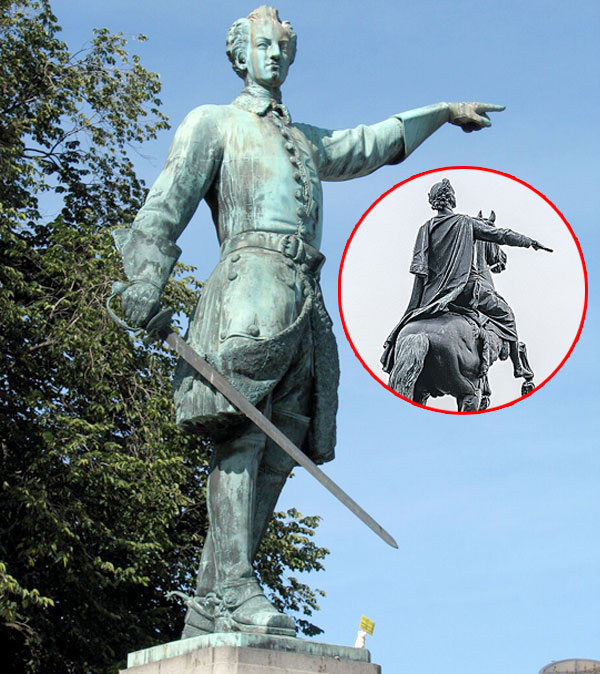 Государь правой рукой указывает в сторону Швеции. А в центре Стокгольма установлен памятник Карлу XII, противнику Петра I в Северной войне. Левая рука короля направлена в сторону России.