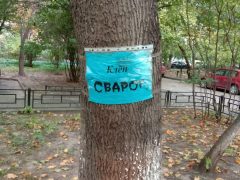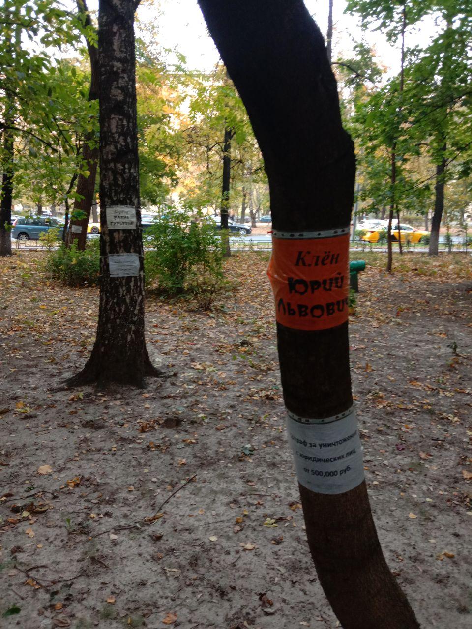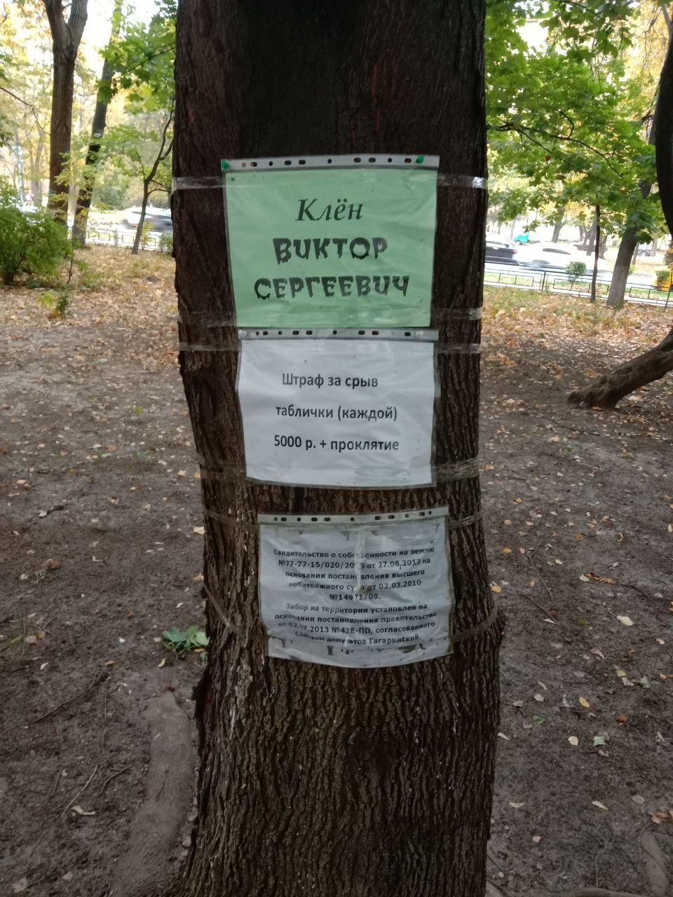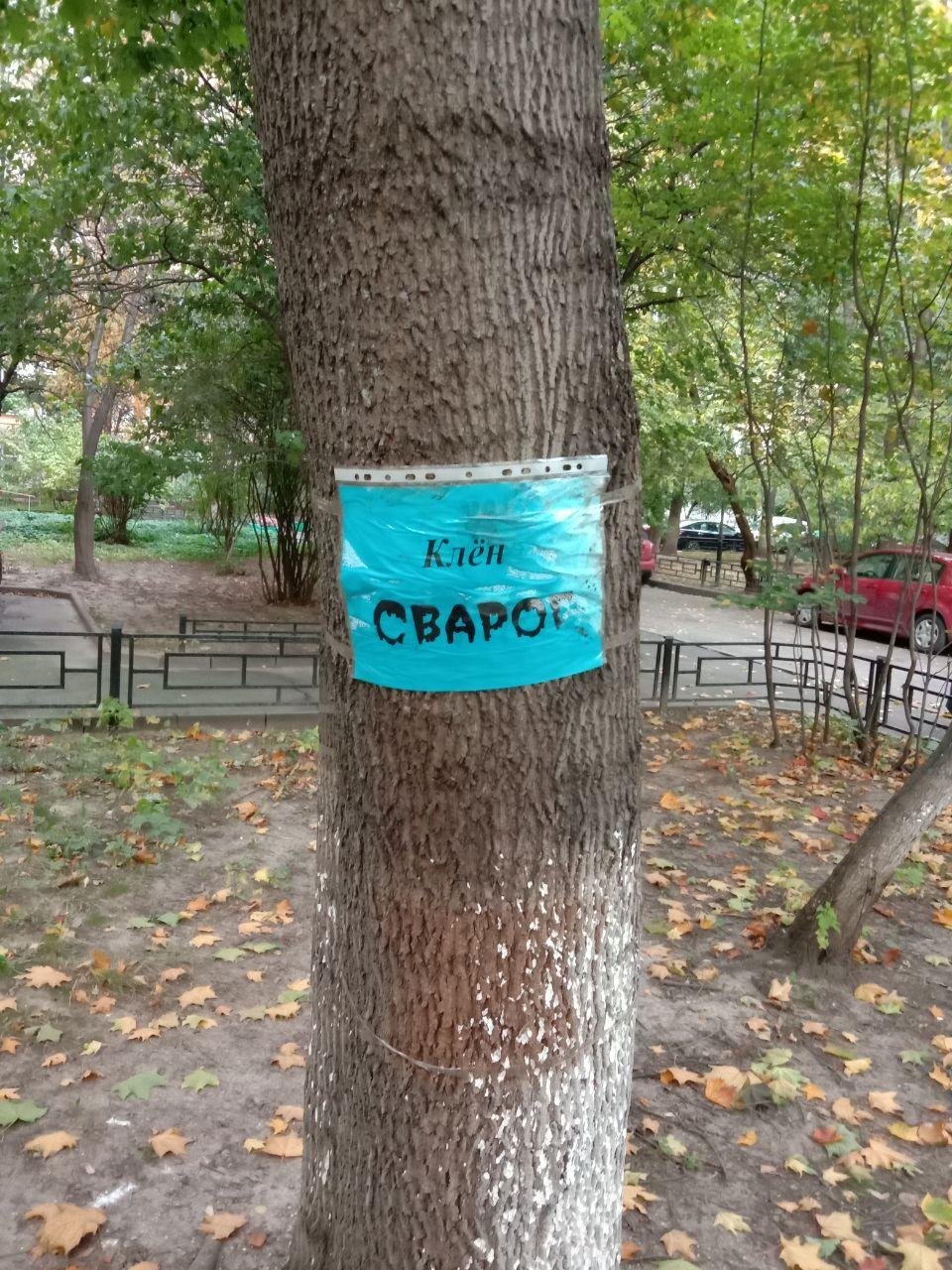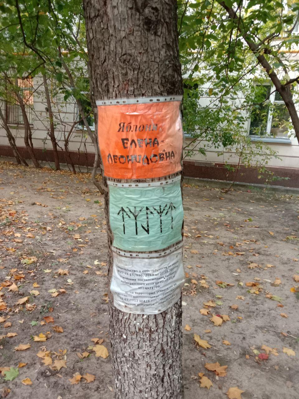На прощание с районом, где прошла часть моей юности, обхожу окрестности. Внимание привлекают объявления, прикрепленные на деревьях. Каждое из них получило имя: Клен Юрий Львович, Береза Евгения Леонидовна, Клен Сварог. Некоторые деревья украшены языческими рунами. Чувствую себя героем «Властелина колец», где среди сказочных персонажей присутствуют разумные и ходящие деревья — энты.