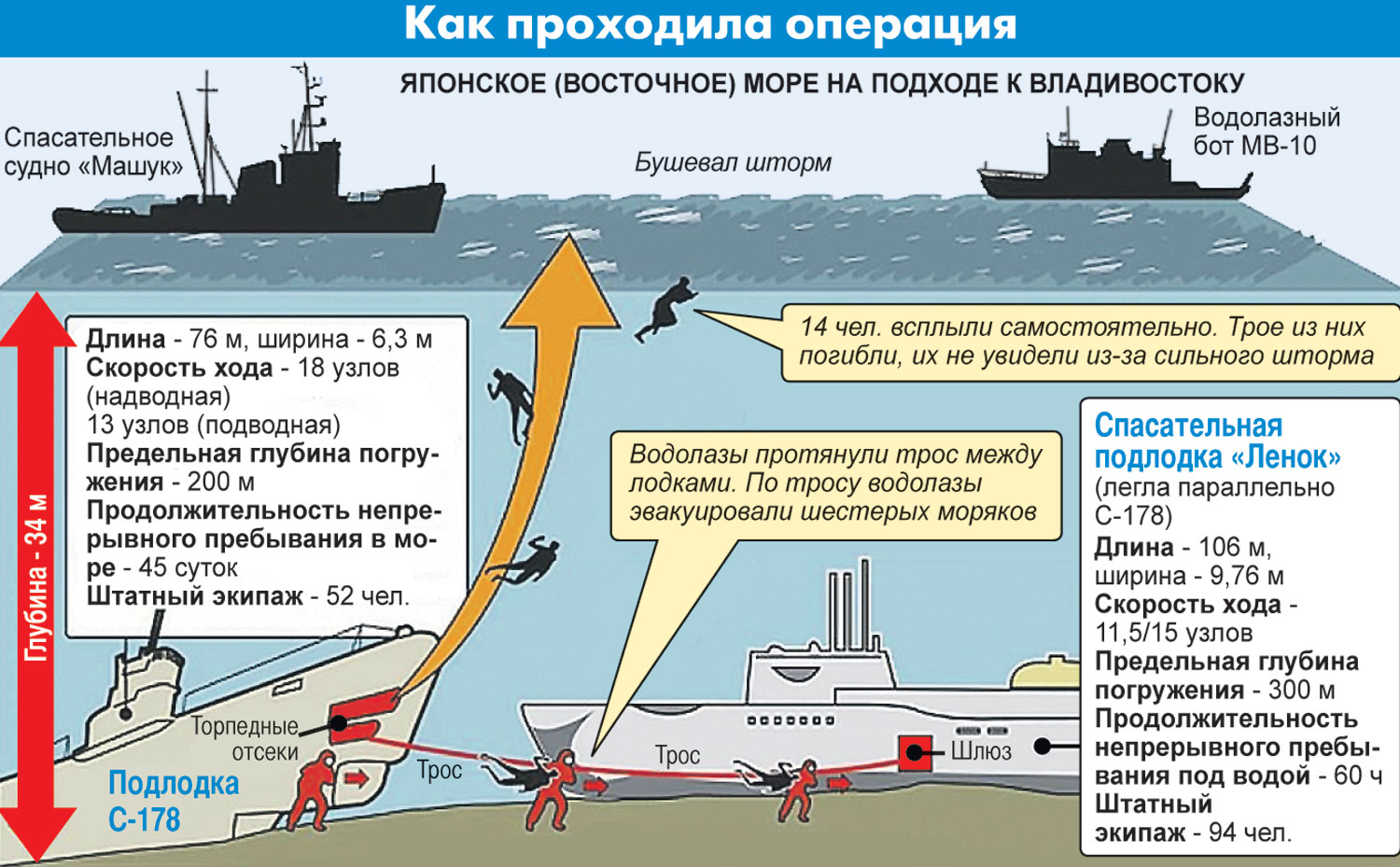 Тем временем по аварийно-сигнальному бую подводники установили связь со спасателями. На связь вышел начальник штаба ТОФ Рудольф Голосов, с которым Сергей Кубынин согласовал план по выходу людей из затопленных отсеков. Но из-за шторма связь оказалась нарушена. Кроме того, к операции привлекли подлодку спасателя «Ленок», и это стало фатальной ошибкой. Ее аккумуляторные батареи исчерпали свой ресурс. К тому же был неисправен гидроакустический комплекс, который должен был обнаружить С-178. Из-за этого затонувшую подлодку искали больше суток. На «Ленке» не хватало водолазов, а те, кто был, никогда не работали в экстремальных условиях.