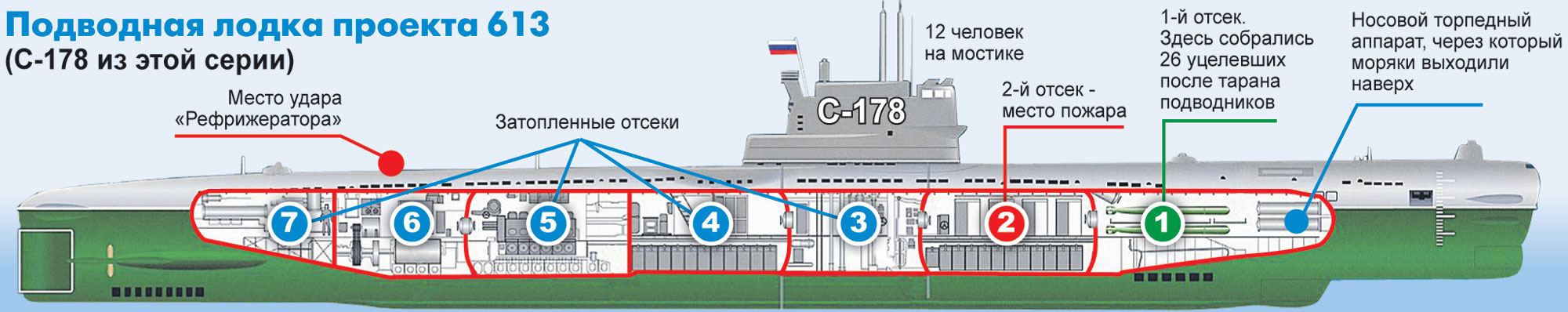 Командир С-178 Валерий Маранго успел скомандовать: «Право на борт!». Подводникам не хватило несколько секунд, чтобы разминуться с «Реф-13» - тот на полном ходу врезался в шестой отсек. Все, кто находился на мостике, оказались за бортом – лишь один механик Валерий Зыбин успел прыгнуть в шахту верхнего рубочного люка.