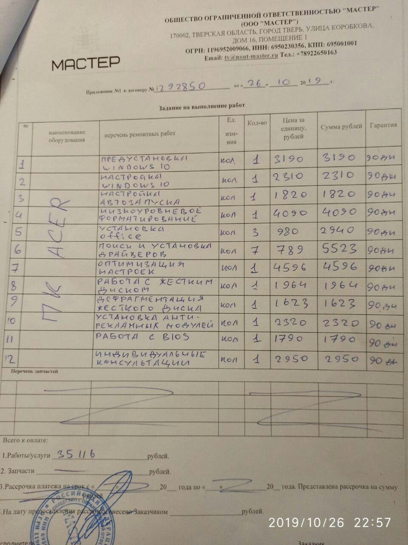 Предприимчивый мастер, по-видимому, придумал услуги на ходу, как и их стоимость, и от руки написал прайс. Так, в квитанции числятся загадочная «предустановка Windows 10»; невнятный процесс «оптимизации настроек», не требующая абсолютно никаких затрат дефрагментация жесткого диска и многое другое. Цена за каждую услугу — от 789 до 4596 рублей. А «индивидуальные консультации» мастер оценил в 2950 рублей.