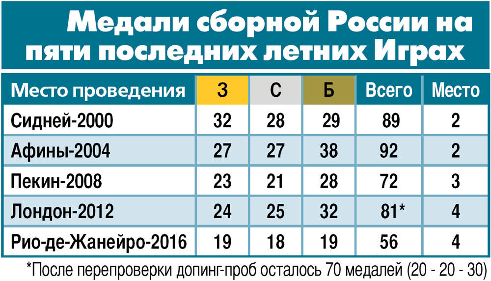 На предыдущих летних Играх 2016 года в Рио-де-Жанейро в сборной было на полсотни спортсменов больше, чем поехали сейчас. И это притом что из-за допинговых скандалов к участию не допустили команды по тяжелой и легкой атлетике. Всего в Бразилии нам удалось выиграть 56 медалей (см. табл.). Перед теми Играми тогдашний президент ОКР Александр Жуков амбициозно заявил: