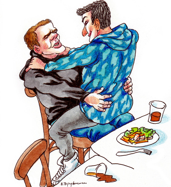 Часов в 8 - 9 утра компания переместилась в «Кофеманию». С Кокориным-старшим была девушка. Она садилась верхом на Александра. Хотя кому подставлять колени, нападающий «Зенита» мог выбирать: на него присаживался и Геннадий Куропаткин.