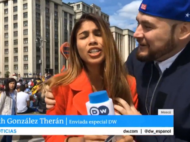 Российский болельщик извинился перед журналисткой Deutsche Welle Жюльет Гонсалес Теран. Во время прямого эфира мужчина поцеловал девушку и обнял ее в области груди. Затем он крикнул «Россия — чемпион» и скрылся из кадра.