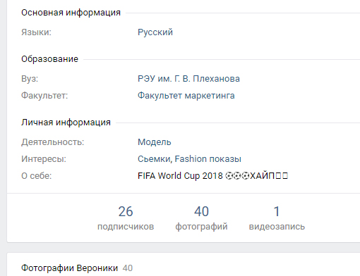 Отметим, что Вероника на двух других девушек не похожа: страничка «ВКонтакте» не выдает в ней представительницу ЛГБТ-сообщества, да и о политике Ника не пишет. Так зачем же ей было участвовать в этом цирке? Ответ мы видим в описании ее профиля (пункт «О себе»).