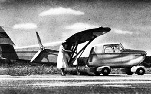 1946 г.: «Аэрофибия» Роберта Фултона. Изобретатель не стал приспосабливать автомобиль к небу, а заставил ездить по земле самолет. Крылья и секция хвоста аппарата снимались, пропеллер складывался внутри фюзеляжа. Имелся шестицилиндровый двигатель мощностью 150 л. с. «Аэрофибия» летала со скоростью 190 км/ч, разгонялась на шоссе до 80 км/ч и стала первым в мире летающим автомобилем, получившим сертификат Управления гражданской авиации США. Но на массовое производство не нашлось денег.