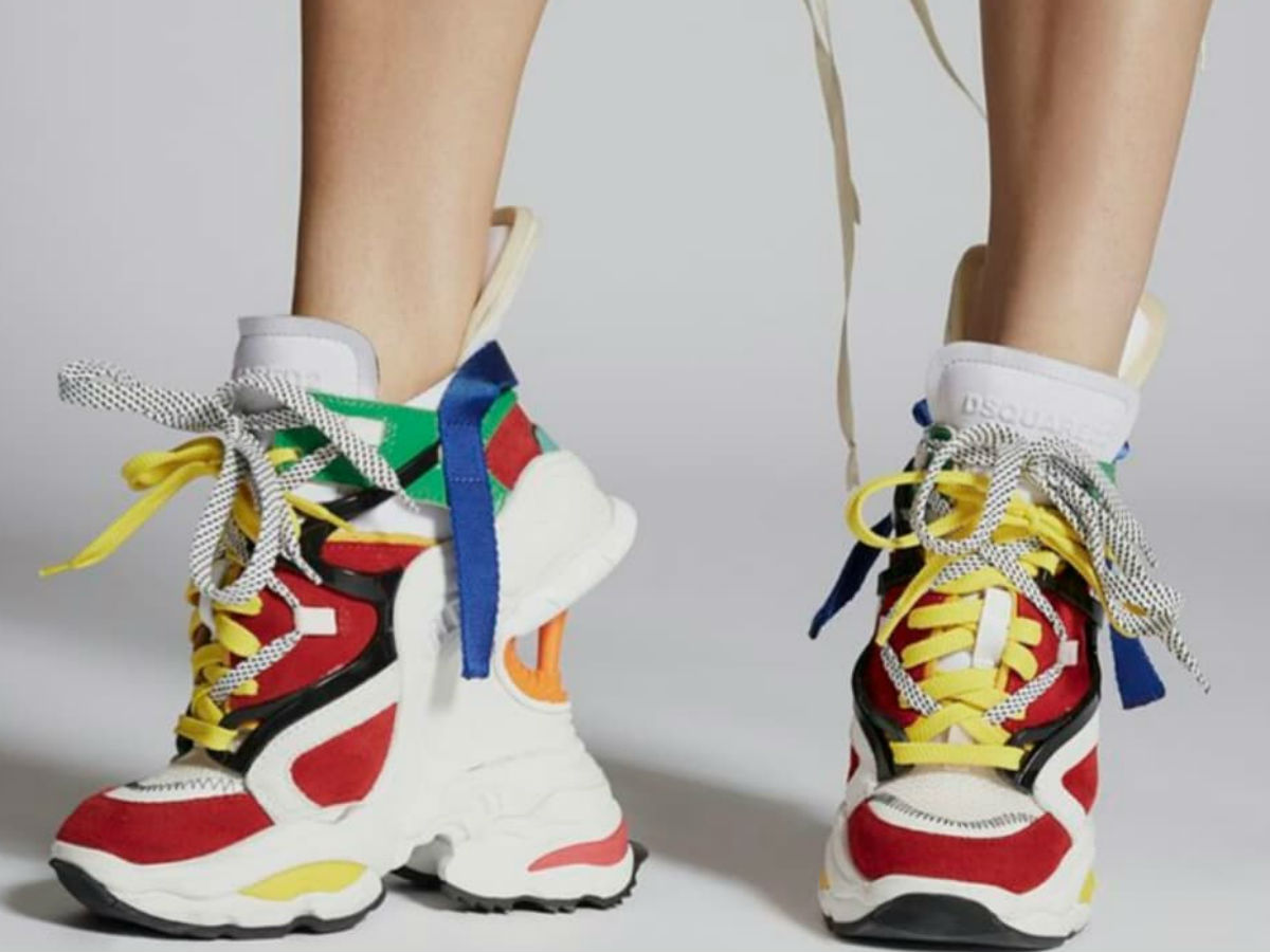 Обувь на платформе не перестает быть актуальной, однако Dsquared2 довели кроссовки на массивной подошве до гротескного вида.