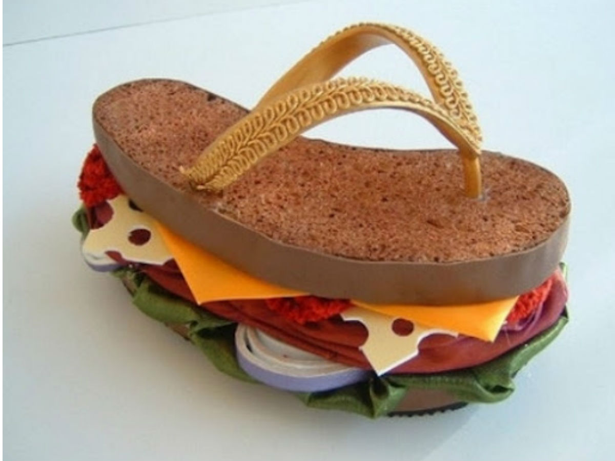 По-прежнему актуальны шлепанцы самого неожиданного вида: в форме золотых рыбок или бутербродов. Последние, к слову, выглядят так натурально, что хочется намазать их сливочным маслом.