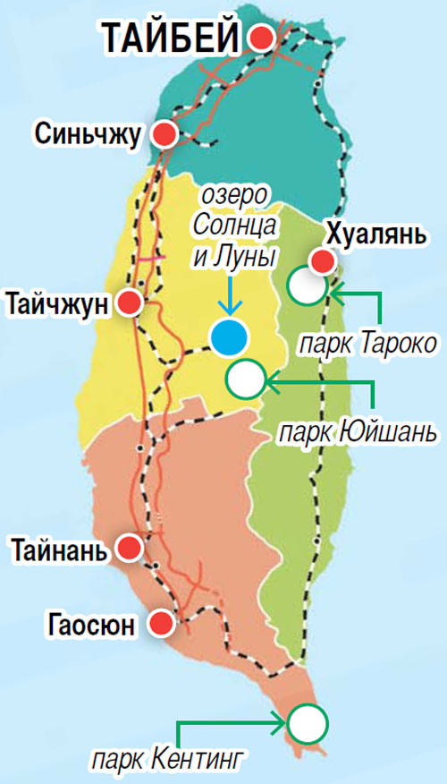 Южнее, неподалеку от деревеньки Юли, национальный парк Юйшань. Горные пики, альпийские озера и невероятное биологическое разнообразие. Чуть углубишься и натыкаешься на оленей, тайваньских макак и небольших черных медведей. Правда, гораздо больше неприятностей вам могут доставить не они, а противнейшие крошечные сухопутные пиявки, которые забираются на вас с земли и присасываются к ногам. Особого вреда от них нет, но отдирать неприятно. На южном краю острова еще один нацпарк - Кентинг. Пешеходных маршрутов меньше, и местность не такая уж дикая. Исследовать парк лучше всего на арендованном мотобайке (500 тайваньских баксов в день). Доехать стоит и до красивых пляжей - вода теплая круглый год.