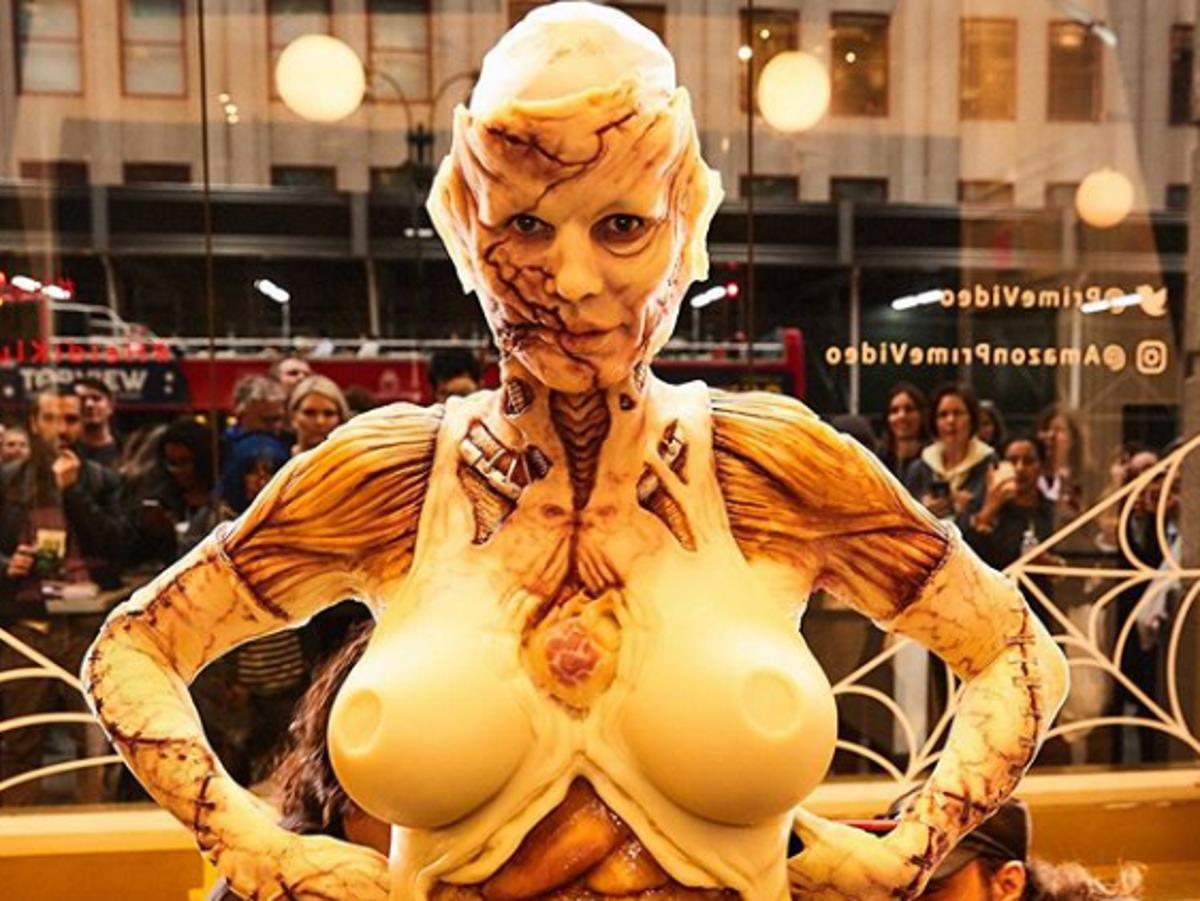 На этот раз Хайди вновь превзошла саму себя и перевоплотилась в ужасающего инопланетянина. Гримеры изменили фигуру и лицо Хайди до неузнаваемости и нанесли огромное количество грима и специального материала, с помощью которого можно изменить пропорции тела и добавить определенные детали. При этом за перевоплощением Клум следили не только подписчики ее «Инстаграма*», но и простые прохожие, так как вся работа проходила за обычным стеклом.
